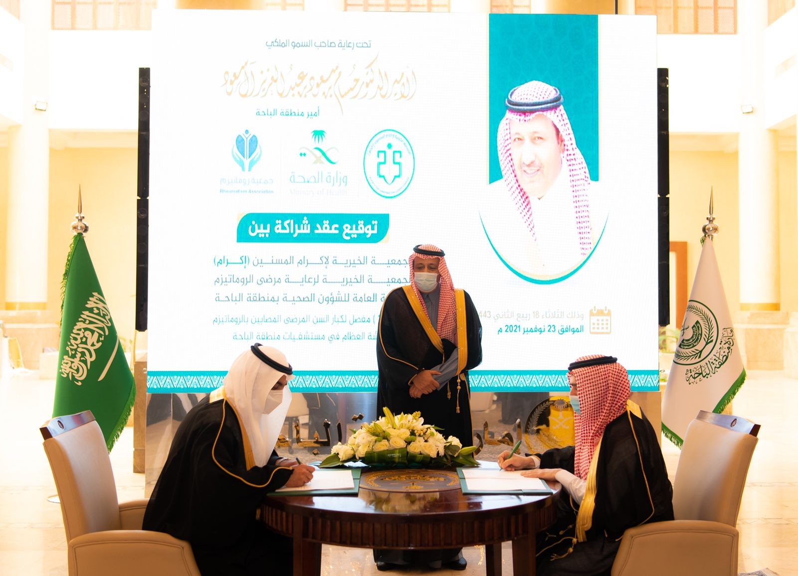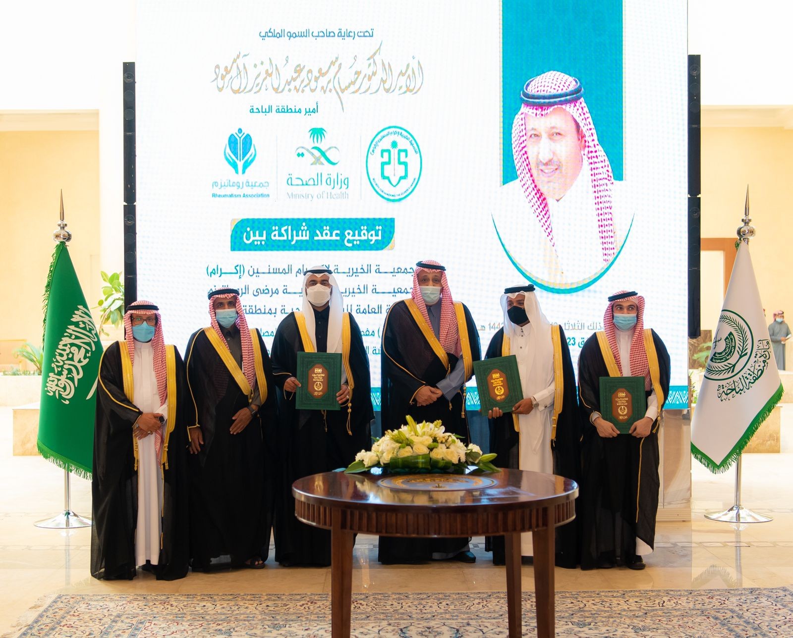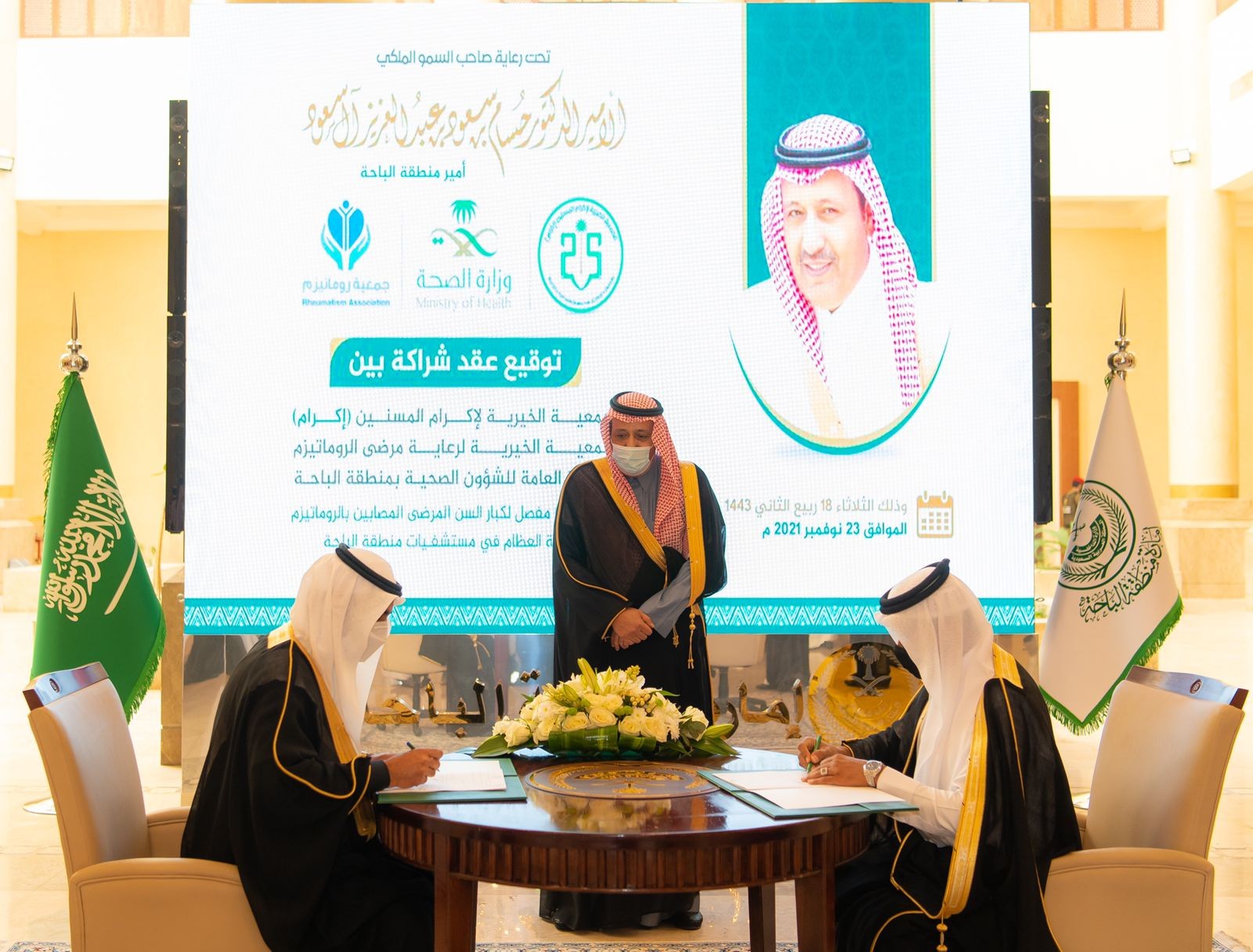شهد صاحب السمو الملكي الأمير الدكتور حسام بن سعود بن عبدالعزيز أمير منطقة الباحة بديوان الامارة اليوم ، مبادرة امارة المنطقة لتوقيع عقد تنفيذ عمليات تبديل مفاصل للمرضى المسنين المحتاجين لعمليات التبديل بالشراكة بين المديرية العامة للشؤون الصحية بمنطقة الباحة من جه وبين كل من الجمعية الخيرية لإكرام المسنين (إكرام) والجمعية الخيرية لرعاية مرضى الروماتيزم وذلك بحضور مدير عام الشؤون الصحية بالمنطقة الدكتور سمير بن مشبب الشهراني ومدير عام فرع وزارة الموارد البشرية والتنمية الاجتماعية بالمنطقة شايق بن محمد الشايق ورئيسي مجلس إدارة جمعية إكرام وجمعية الروماتيزم .