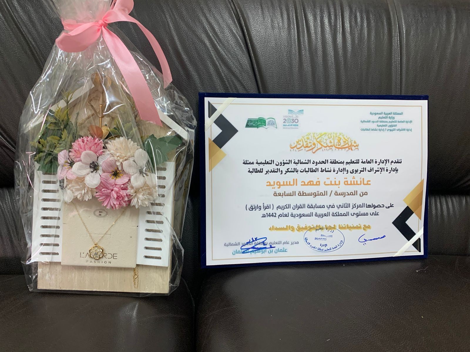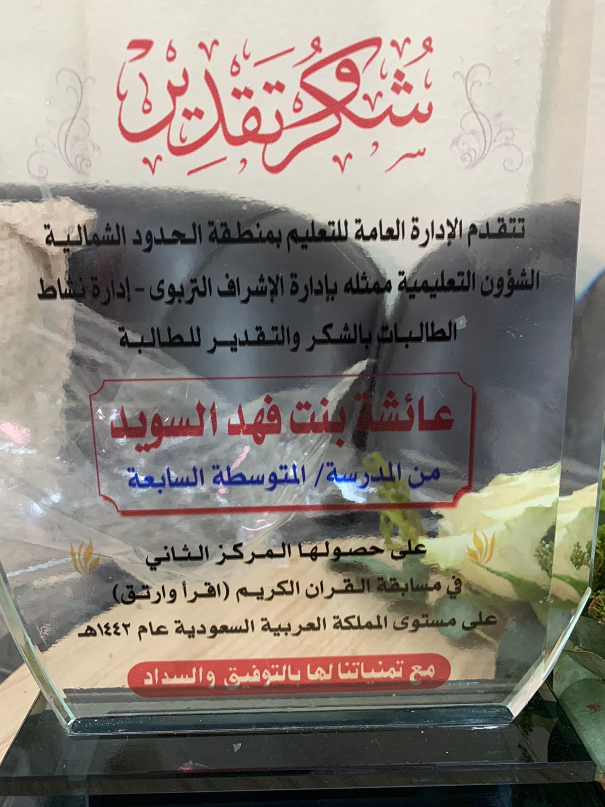 كرمت اليوم المساعد للشؤون التعليمية بنات الأستاذة نورة بنت عبدالعزيز الفايز من الإدارة العامة للتعليم بمنطقة الحدود الشمالية الشؤون التعليمية بنات الطالبة عائشة فهد السويد في المتوسطة السابعة بعرعر على حصولها على المركز الثاني في مسابقة القرآن الكريم (اقرأ وارتق ) على مستوى المملكة لعام١٤٤٢هـ كما كرمت أيضا مديرة المدرسة الأستاذة جواهر عبدالرحمن الرويلي والمعلمات وبحضور مديرة إدارة الإشراف التربوي الأستاذة هدى الخضر.