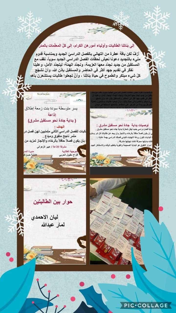 أقامت متوسطة سودة بنت زمعة التابعة لمكتب تعليم شمال مكة بالإدارة العامة للتعليم بمنطقة مكة المكرمة يوم الأحد الموافق 1 / 5 / 1443هـ، بإشراف مديرة المدرسة عائشة دبلول برامج تعزيزية لتهيئة الطالبات مع بداية الفصل الدراسي الثاني مع اتخاذ كافة التدابير اللازمة حيثُ تم خلال البرنامج تهنئة الطالبات بالفصل الدراسي الجديد ، والتشجيع على الابتكار وتنظيم الوقت ، وتقديم العديد من البرامج الإرشادية الهادفة .