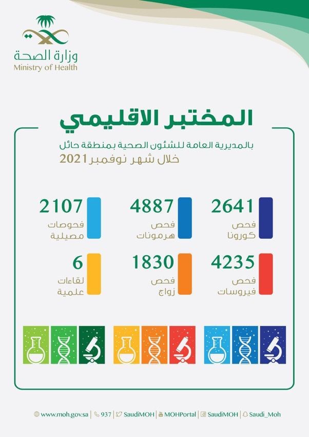 أجرى المختبر الإقليمي بصحة منطقة حائل خلال شهر نوفمبر 2021م عدد "15700" فحصاً مخبرياً وستة لقاءات علمية.