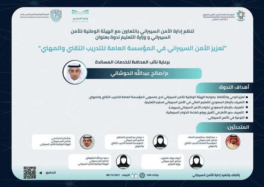 والتي تهدف لتعزيز الوعي والثقافة بضوابط الهيئة الوطنية للأمن السيبراني لدى منسوبي المؤسسة العامة للتدريب التقني والمهني والتعريف بالإطار السعودي للتعليم العالي في الأمن السيبراني(سايبر التعليم) والتعريف بالإطار السعودي لكوادر الأمن السيبراني(سيوف) ودور الأطر في تأهيل ورفع كفاءة الكوادر السيبرانية والتوعية في الأمن السيبراني.
