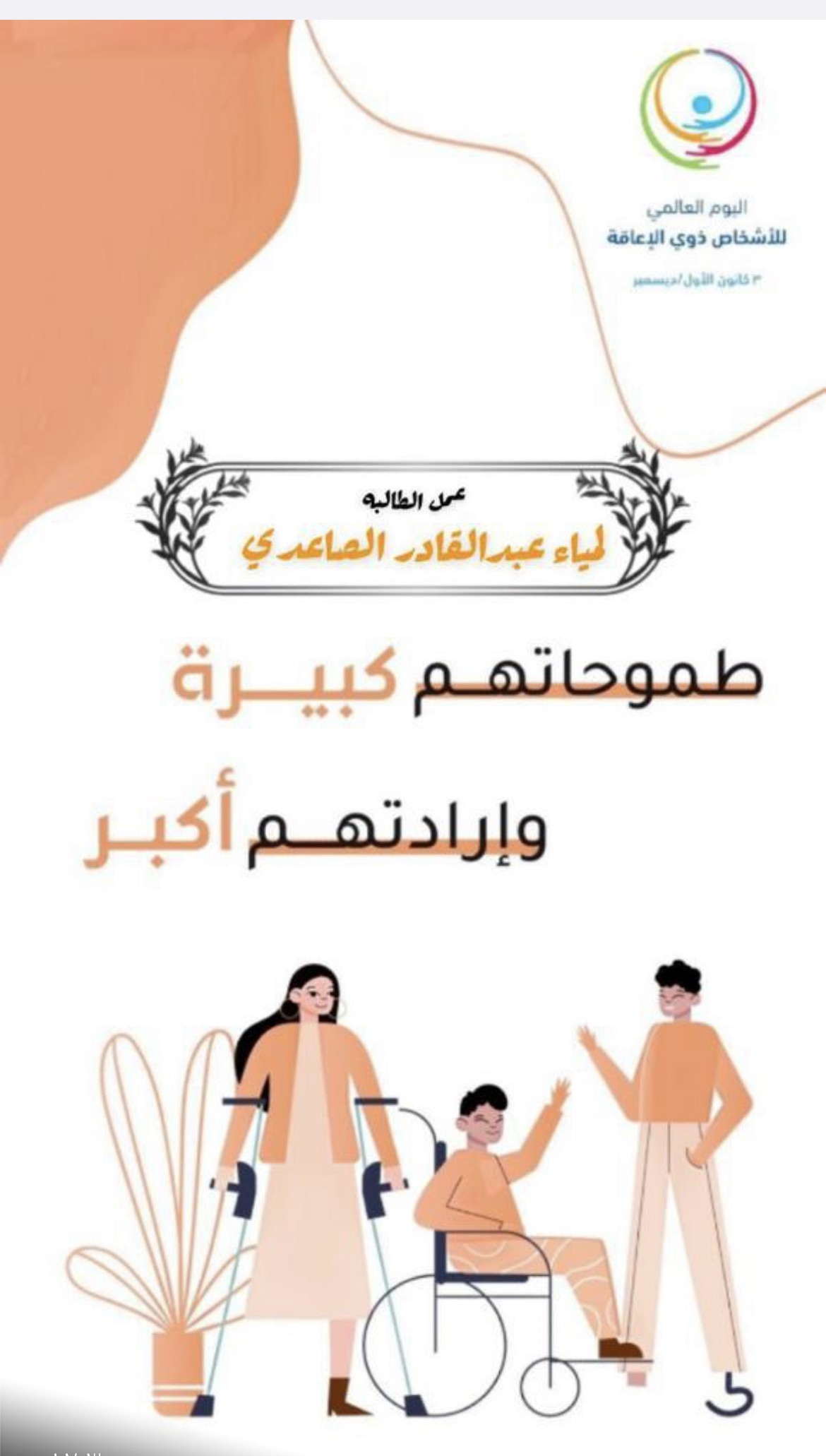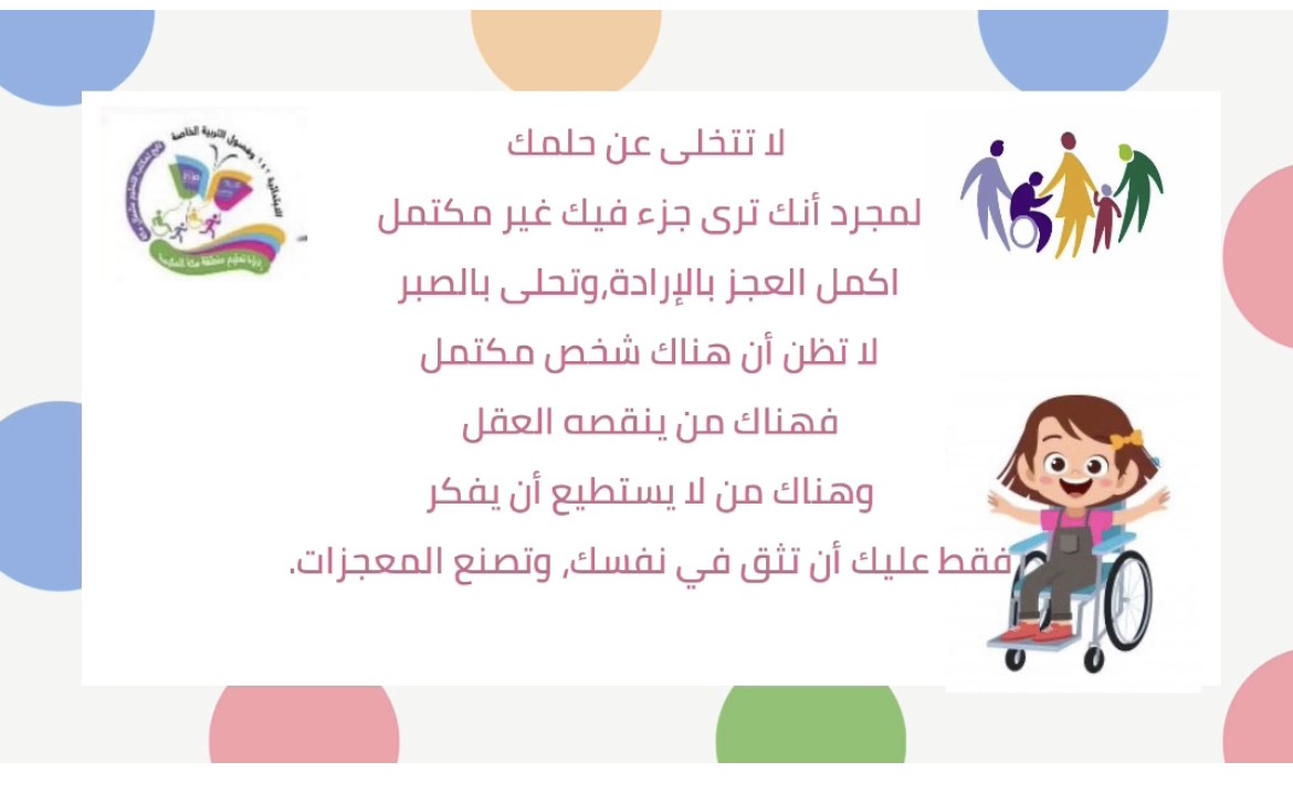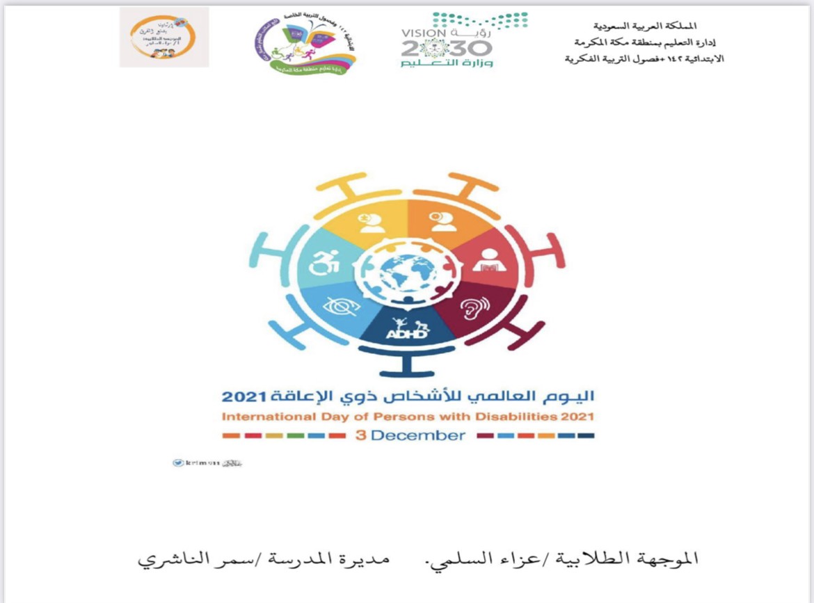 أقامت الابتدائية الثانية والأربعون بعد المائة والفصول الفكرية التابعة لمكتب تعليم شمال مكة بالإدارة العامة للتعليم بمنطقة مكة المكرمة يوم الإثنين الموافق 2 / 5 / 1443هـ، احتفالاً باليوم العالمي للأشخاص ذوي الإعاقة نفذهُ الموجهة الطلابية عزاء السلمي بمتابعة مديرة المدرسة سمر الناشري.