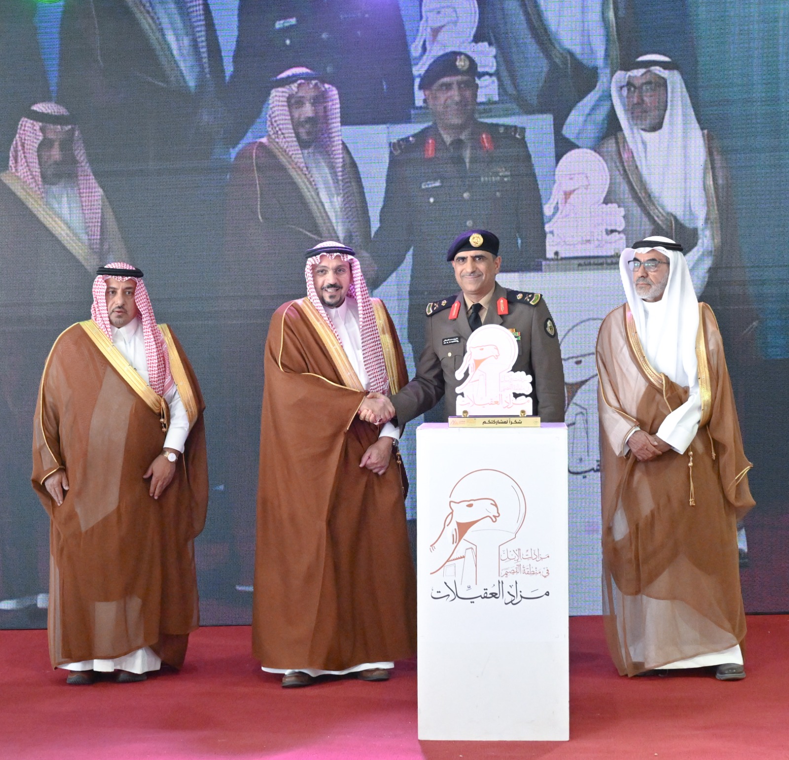 وتخلل الحفل كلمة للمشرف العام على سكرتارية مزادات الإبل بإمارة القصيم اللواء متقاعد عبدالله البدراني، أعرب فيها عن شكره وتقديره لسمو أمير منطقة القصيم على دعمه الدائم وعنايته المستمرة بمزادات الإبل، مؤكدًا أن هذا الدعم جعل منها حدثًا موسميًا ينتظره ملاك الإبل والمهتمون بها في مختلف مناطق المملكة، وأسهم في تعزيز موقع القصيم وجهة رئيسية لاقتصاديات الإبل ومزاداتها المتميزة.