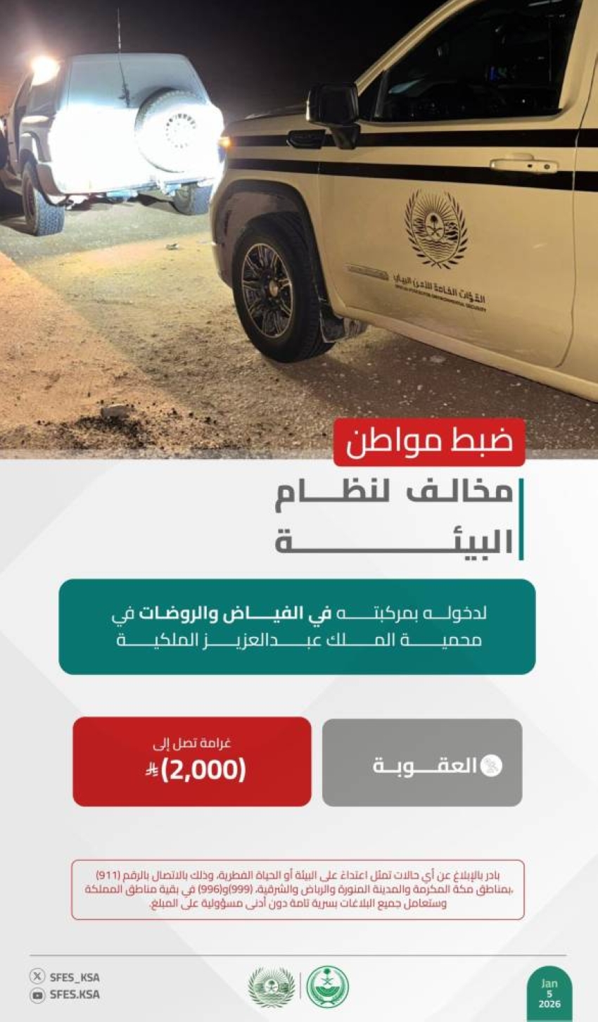 وأوضحت القوات أن عقوبة دخول المركبات والسيارات الفياض والروضات البرية المحمية غرامة تصل إلى (2,000) ريال، حاثةً على الإبلاغ عن أي حالات تمثل اعتداءً على البيئة أو الحياة الفطرية على الرقم (911) بمناطق مكة المكرمة والمدينة المنورة والرياض والشرقية، و(999) و(996) في بقية مناطق المملكة، وستعامل جميع البلاغات بسرية تامة دون أدنى مسؤولية على المبلّغ.