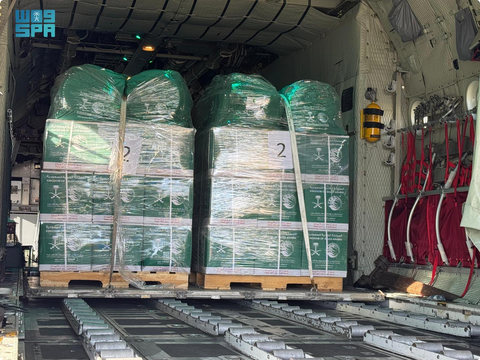 وتحمل الطائرة السعودية على متنها سلالًا غذائية وحقائب إيوائية، تمهيدًا لنقلها إلى المتضررين من الشعب الفلسطيني الشقيق داخل قطاع غزة.