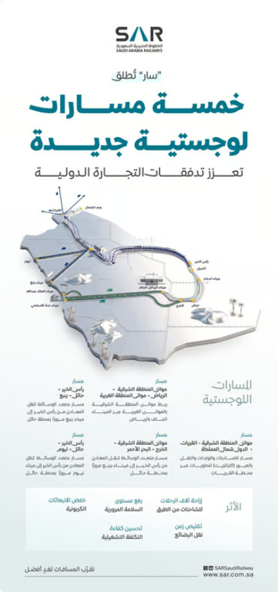وتعمل "سار" من خلال هذه المسارات على تعزيز التكامل بين النقل الحديدي والبحري والبري، بما يدعم النمو الاقتصادي ويخدم القطاعات الصناعية والتجارية في المملكة.