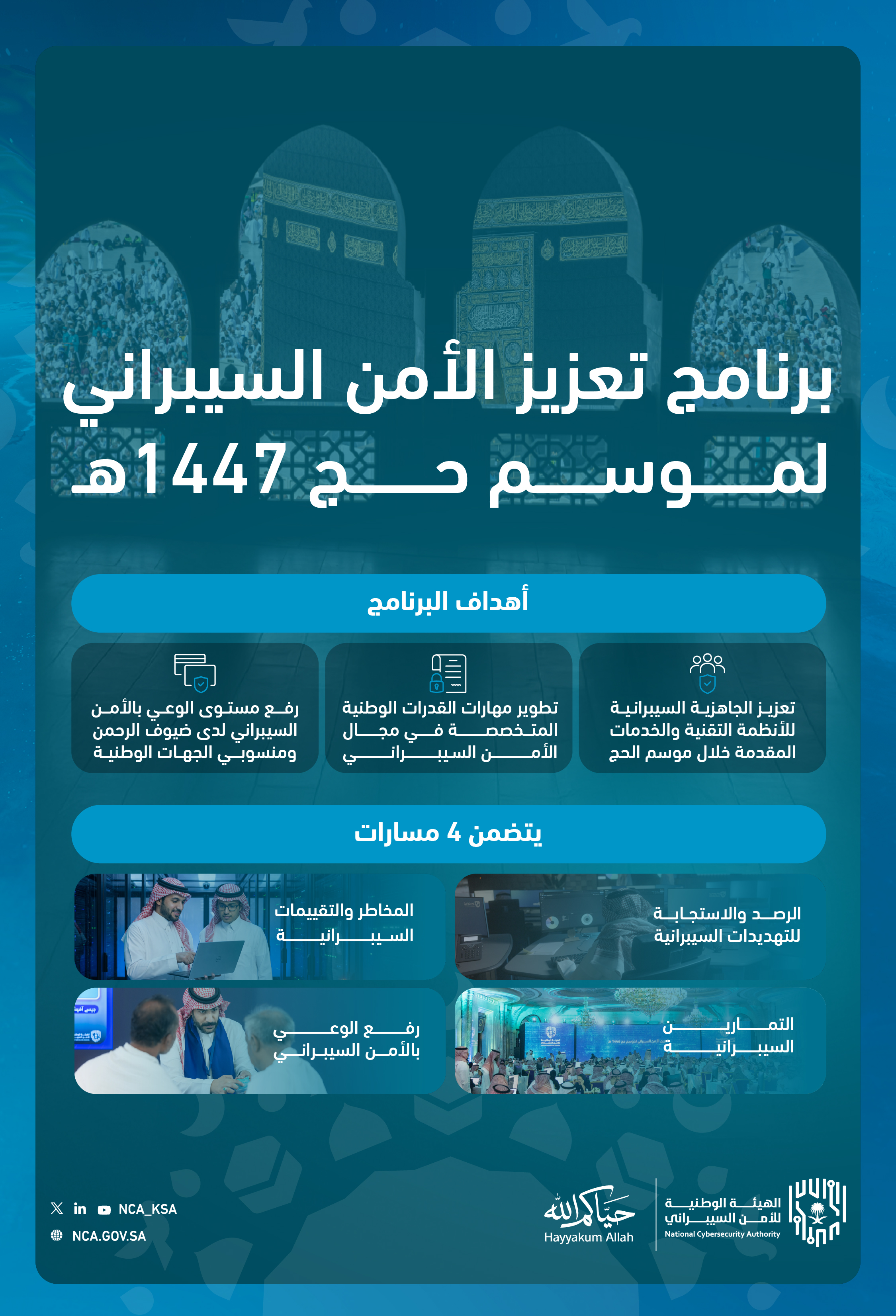 ويرتكز «برنامج تعزيز الأمن السيبراني لموسم حج 1447هـ»، على أربعة مسارات رئيسية هي: «الرصد والاستجابة للتهديدات السيبرانية، المخاطر والتقييمات السيبرانية، التمارين السيبرانية، رفع الوعي بالأمن السيبراني»، كما يشتمل على تفعيل غرفة للعمليات السيبرانية تعمل على مدار الساعة لرصد وتحليل التهديدات السيبرانية ومشاركتها مع الجهات الوطنية، وتخصيص فرق الاستجابة للحوادث السيبرانية، فضلاً عن حصر الأصول والخدمات والأنظمة التقنية المرتبطة بموسم الحج عبر البوابة الوطنية لخدمات الأمن السيبراني (حصين)، ووضع خطط لمساندة الجهات الوطنية في إجراء التقييمات السيبرانية للأنظمة والخدمات التقنية المقدمة خلال الموسم.