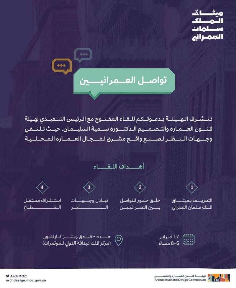 الخميس القادم :هيئة فنون العمارة والتصميم تنظم لقاء "تواصل العمرانيين" بجدة
