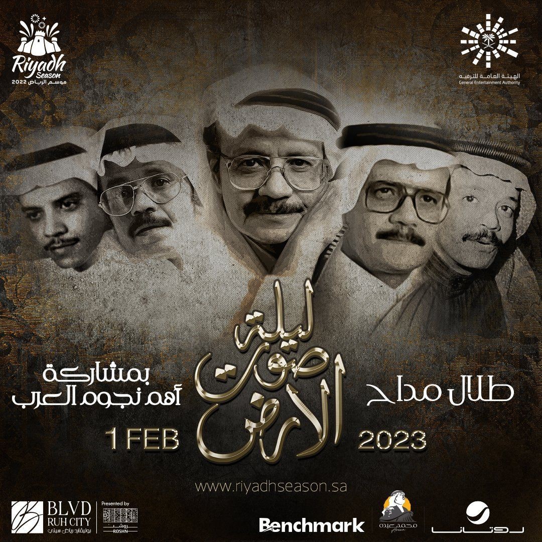 وستصدح ليلة صوت الأرض بحلو المغنى الذي غمر الأقطار العربية، منذ عام 1955- 2000م، لتكون ليلة غنائية استثنائية يُبقي موسم الرياض صداها في مسامع الحضور تقديرًا لرموز خدموا الأغنية السعودية طوال مسيرتهم الفنية.