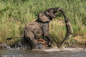 هكذا تصرف فيل عندما قضم تمساح صغير خرطومه أثناء شرب المياه
