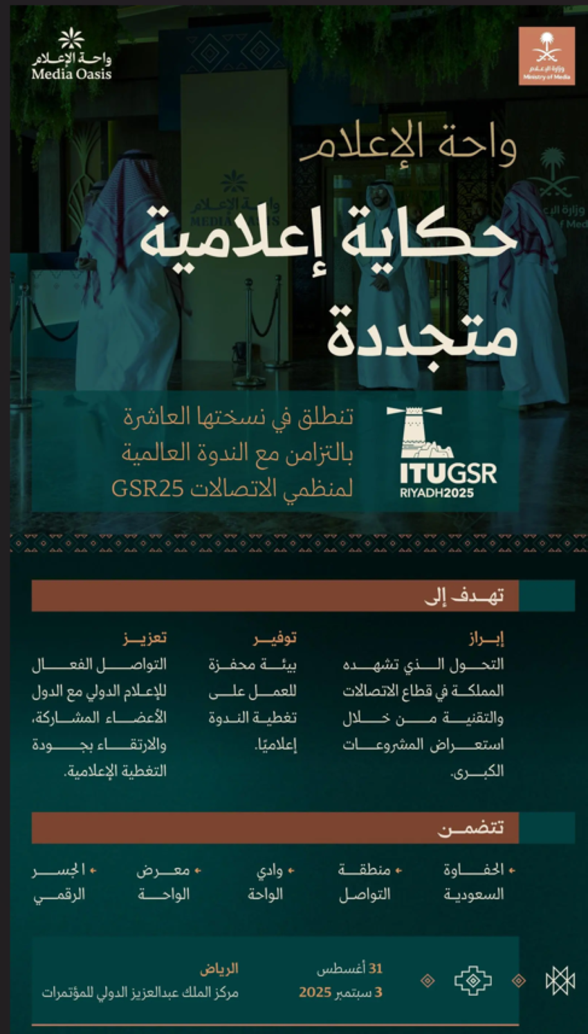 أعلنت وزارة الإعلام عن إقامة "واحة الإعلام"، بالشراكة مع هيئة الاتصالات والفضاء والتقنية خلال الفترة من 31 أغسطس- 3 سبتمبر 2025، في مركز الملك عبدالعزيز للمؤتمرات بمدينة الرياض، تزامنًا مع أعمال الندوة العالمية لمنظمي الاتصالات (GSR25).