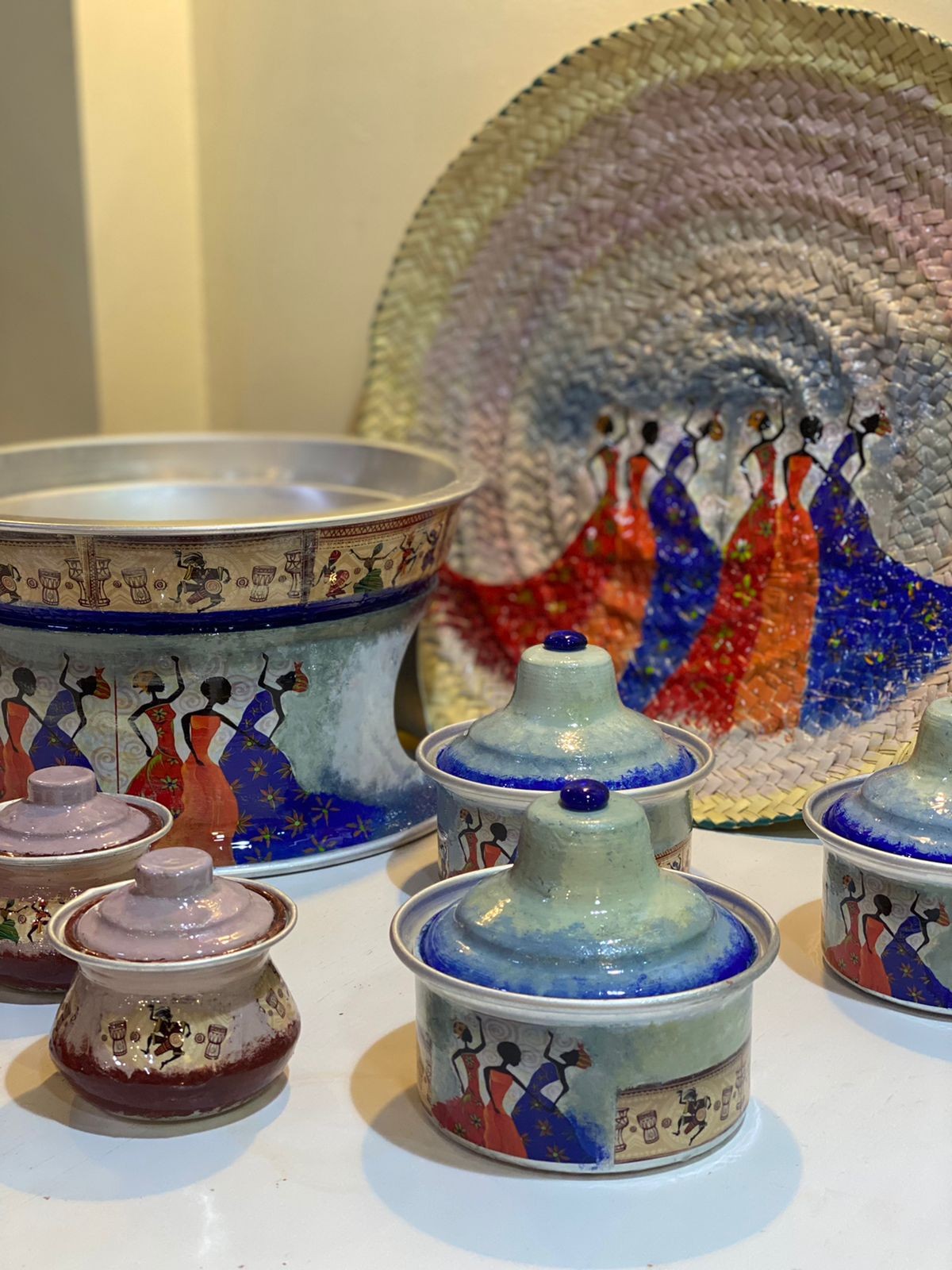 كذلك نسبة لعشقي لتنسيق الديكور وسفرة الطعام، رسمت على الأواني بألوان( الاكريليك)