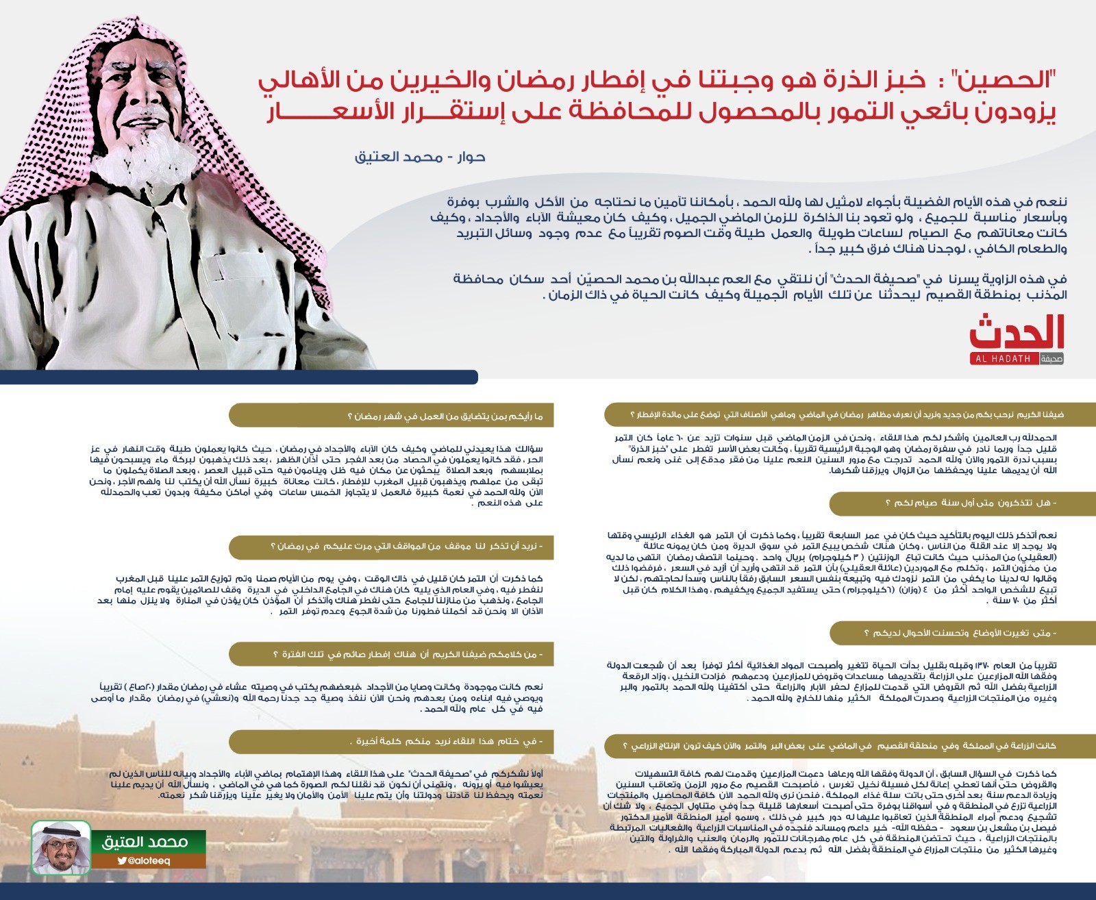 أولاً نشكركم في "صحيفة الحدث" على هذا اللقاء وهذا الإهتمام بماضي الأباء والأجداد وبيانه للناس الذين لم يعيشوا فيه أو يرونه ، ونتمنى أن نكون قد نقلنا لكم الصورة كما هي في الماضي ، ونسأل الله أن يديم علينا نعمته ويحفظ لنا قادتنا ودولتنا وأن يتم علينا الأمن والأمان ولا يغير علينا ويزرقنا شكر نعمته