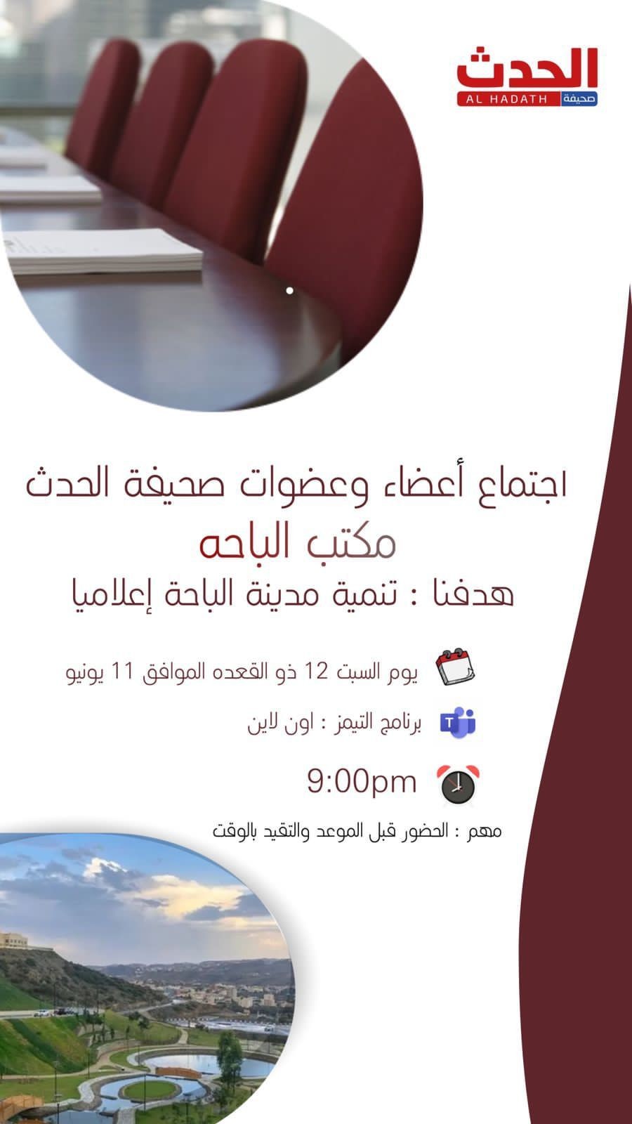 عقد المدير الإقليمي لصحيفة الحدث اجتماعاً عبر منصة الTeamsبأعضاء فريق مكتب الباحة مساء اليوم السبت 11/6/2022 في تمام الساعه التاسعة ، وقد تم خلال الإجتماع مناقشة بعض الأمور الجوهرية الخاصة بتنظيم العمل للمكتب تحقيقاً لرؤية الصحيفة الإلكترونية لتصبح في مصاف الصحف المشار إليها بالبنان .