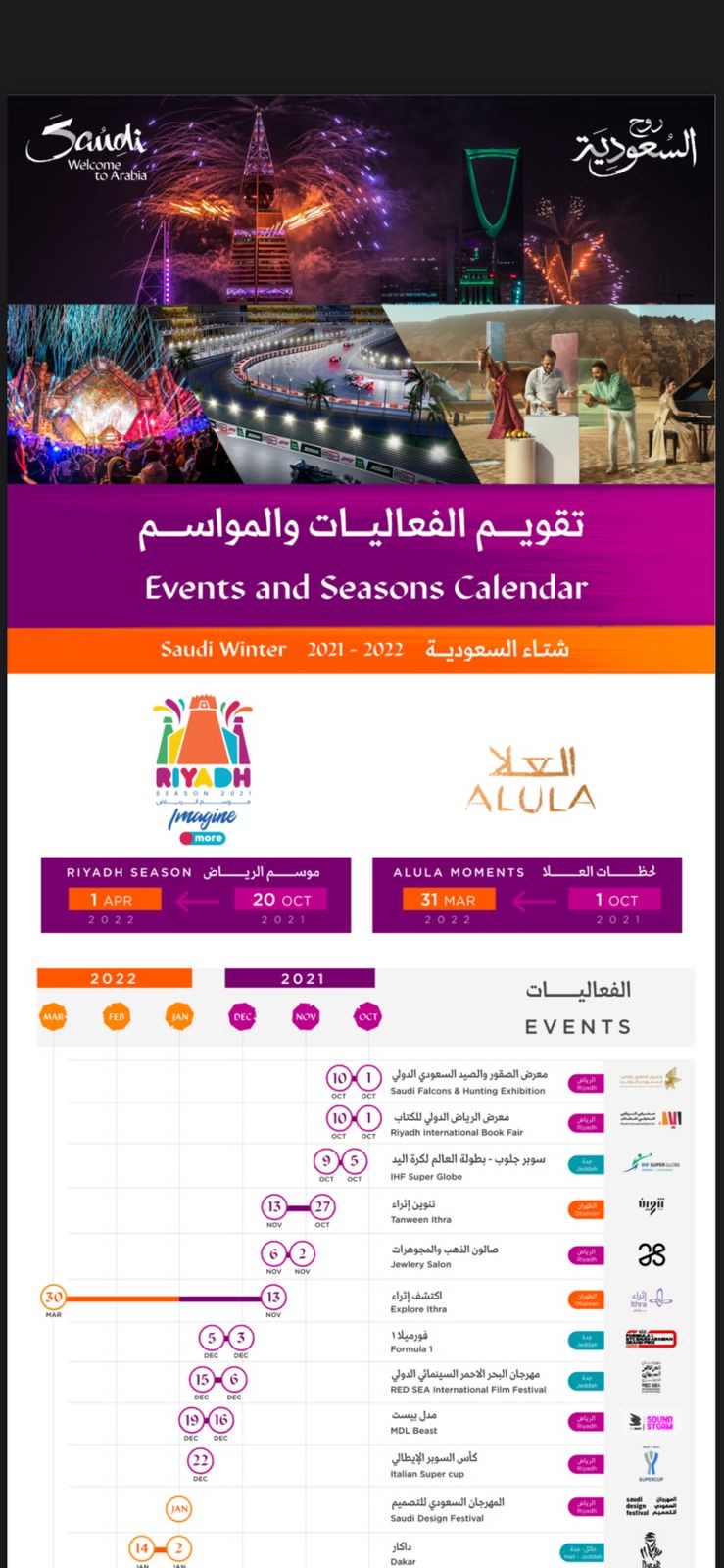 ويأتي الاعلان عن تقويم الفعاليات والمواسم استكمالا لحملة "عن سنتين" والتي وعدت بعودة المواسم بحجم مضاعف وفعاليات أكبر حجما وأكثر تنوعاً، حيث تضمن التقويم فعاليات مضاعفة خلال الفترة الممتدة من أكتوبر 2021 الى مارس 2022 لتلبي كافة تطلعات العوائل والأفراد من مختلف شرائح المجتمع بهدف توفير تجربة سياحية استثنائية لزوار المملكة من الداخل والخارج، مع مراعاة الاشتراطات الصحية والتأكد من التزام الجميع بها بالتنسيق مع الجهات المختصة مما يضمن تجربة سياحيّة وترفيهيّة آمنة وسلسة.