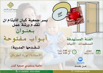 أقامت الجمعية مساء اليوم الثلاثاء 11 يناير 2022 دورة بعنوان" أبواب مفتوحة" قدمتها المستشارة والمدربة نورة محمد الطرباق الحاصلة على دبلوم إرشاد أسري مستشارة ومدربة أسرية وذلك بحضور عدد من مستفيدات كيان عبر منصة زوم.