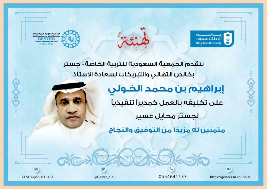 بتعيين الأستاذ/إبراهيم بن محمد الخولي مديراً تنفيذياً لـ " لجستر فرع محايل" لمدة عام واحد وتعتبر الجمعية السعودية للتربية الخاصة إحدى الجمعيات العلمية التابعة لإدارة الجمعيات العلمية بجامعة الملك سعود والتي أنشئت وفق القواعد المنظمة للجمعيات العلمية في الجامعات وسَبَق للخولي  أن شغل منصب المدير التنفيذي لجستر فرع محايل ويتمتع بخبرة إدارية تمتد لعدة سنوات في العمل التطوعي المؤسسي الموجه نفعه وخدمته للأشخاص ذوي الإعاقة