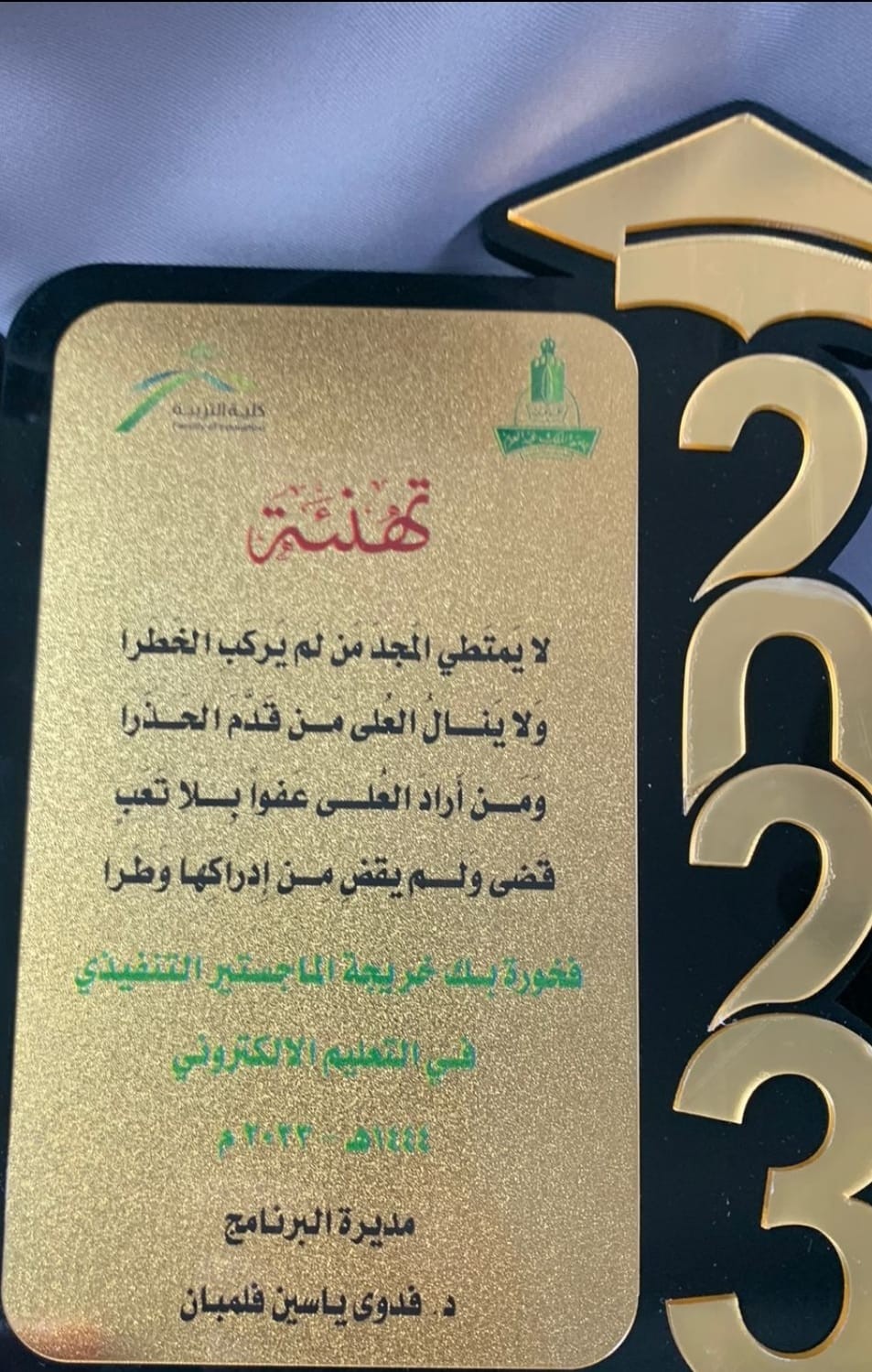 حصلت الأستاذة مريم بنت فرحان الفيفي على درجة الماجستير التنفيذي في التعليم الإلكتروني بتقدير إمتياز من جامعة الملك عبدالعزيز لعام ١٤٤٤ هـ - ٢٠٢٣ م ، هذا وتلقت التهاني والتبريكات من الأهل والأصدقاء بهذه المناسبة الجديرة بالفخر .