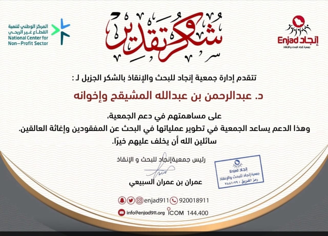 قدمت جمعية إنجاد للبحث والإنقاذ الشكر الجزيل للدكتور عبد الرحمن المشيقح وإخوانه على مساهمتهم في دعم الجمعية الذي ساهم في تطوير عملياتها في البحث والإنقاذ للمفقودين وإغاثة العالقين،