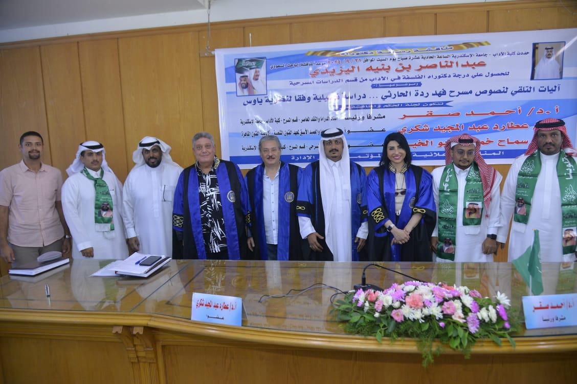 تلقى الدكتور "عبدالناصر بن بنيه اليزيدي " مزيداً من التهاني والتبريكات من الأصدقاء والزملاء والأحباب بمناسبة حصوله على درجة دكتوراة الفلسفة في الآداب من قسم الدراسات المسرحية كلية الآداب "جامعة الإسكندرية، وكان عنوان الرسالة " آليات التلقي لنصوص مسرح فهد ردة الحارثي" دراسة تحليلية وفقاً لنظرية ياوس "كأول طالب سعودي يحصل على هذه الدرجة في الدراسات المسرحية .