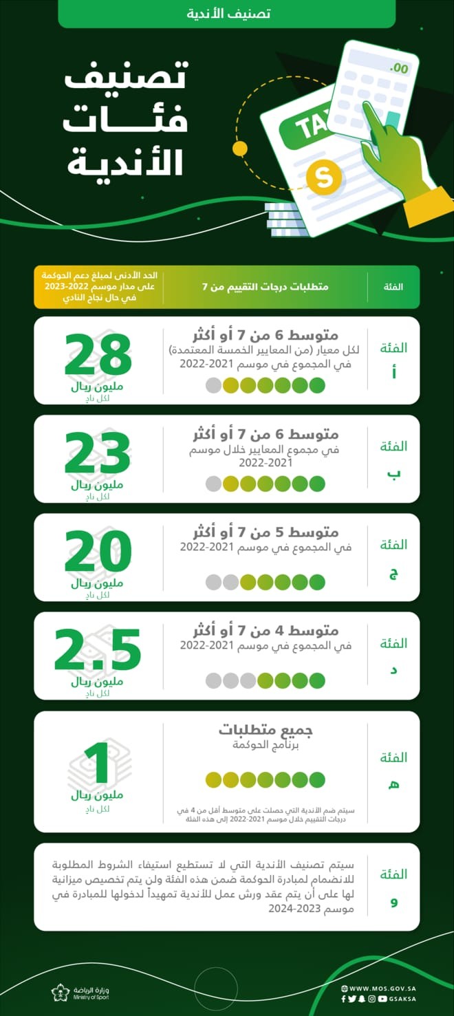 -      فئة (هـ): سيحصل كل نادٍ في هذه الفئة على مبلغ (1) مليون ريال كحد أدنى عند توفيره جميع متطلبات مبادرة نظام الحوكمة، وسينضم أيضا إلى هذه الفئة الأندية التي حصلت على متوسط أقل من 4 من 7 من مجموع المعايير في موسم 2021-2022م.