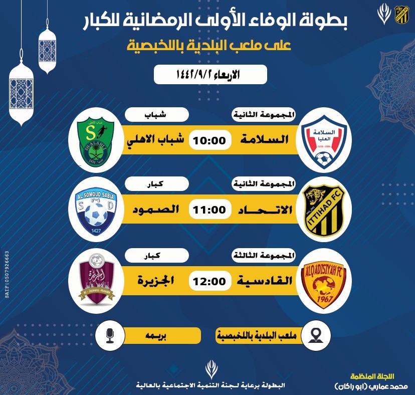 تقام مساء الأربعاء ٢ رمضان ١٤٤٢هـ ثلاث مواجهات قوية في جوهرة اللخبصية ضمن بطولة الوفاء الرمضانية حيث تنطلق المواجهات بلقاء في درجة الشباب بين فريقي السلامة وشباب الأهلي فيما يواجه الإتحاد فريق الصمود في افتتاح مجموعتهما في المباراة الثانية لدرجة الكبار وفي اللقاء الثالث مساء اليوم يصتدم القادسية بالجزيرة في مباراة من العيار الثقيل ليفتتحا مجموعتهما أيضًا.