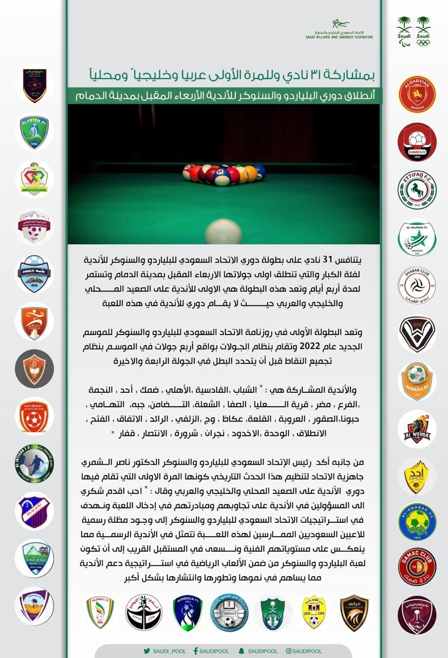 يتنافس 31 نادي على بطولة دوري الاتحاد السعودي للبلياردو والسنوكر للأندية لفئة الكبار والتي تنطلق اولى جولاتها الاربعاء المقبل بمدينة الدمام وتستمر لمدة أربع أيام وتعد هذه البطولة هي الاولى للأندية على الصعيد المحلي والخليجي والعربي حيث لا يقام دوري للأندية في هذه اللعبة.
