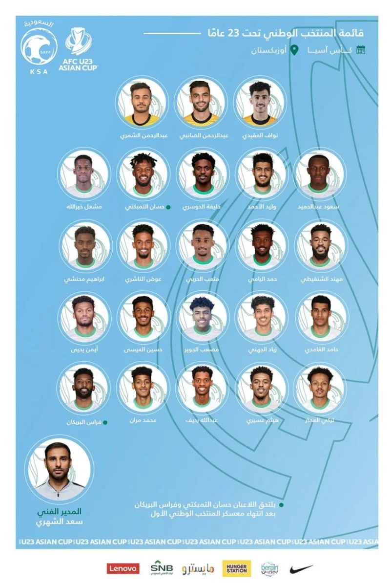 أعلن المدير الفني للمنتخب السعودي تحت 23 عامًا سعد الشهري قائمة "الأخضر" المشاركة في كأس آسيا تحت 23 عامًا 2022 في أوزبكستان.
