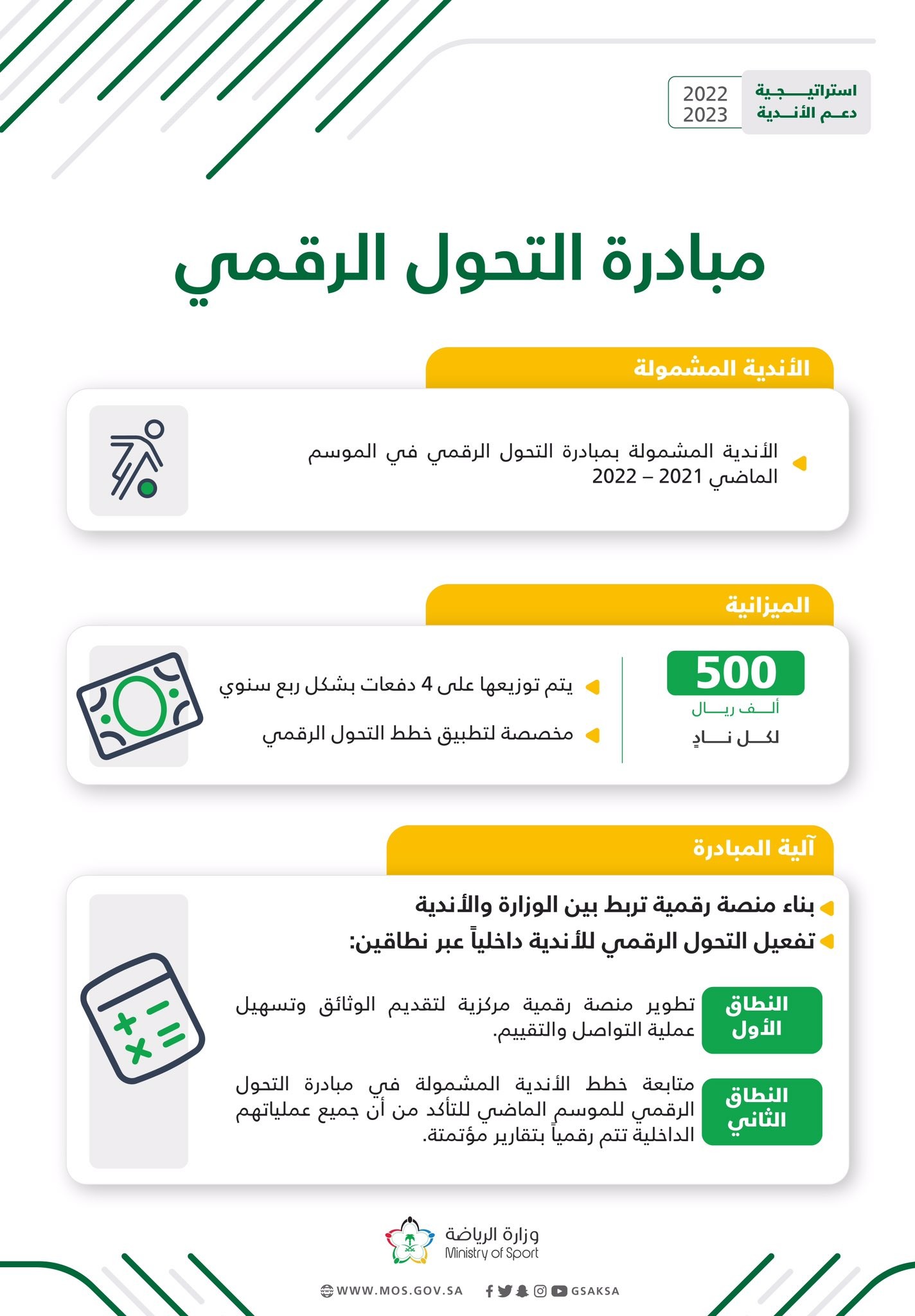 أعلنت وزارة الرياضة اليوم السبت استراتيجية دعم الأندية في عامها الرابع للموسم الرياضي 2022 – 2023