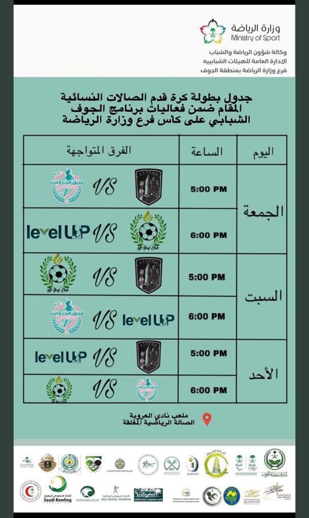 تحت اشراف فرع وزارة الرياضة ولجنة الرياضة المجتمعية بالجوف تنطلق عصر اليوم على صالة نادي العروبة اول بطولة نسائية لكرة القدم صالات بمشاركة اربع فرق هي (سيسرا - الجوف - هت فت - لفل اب )