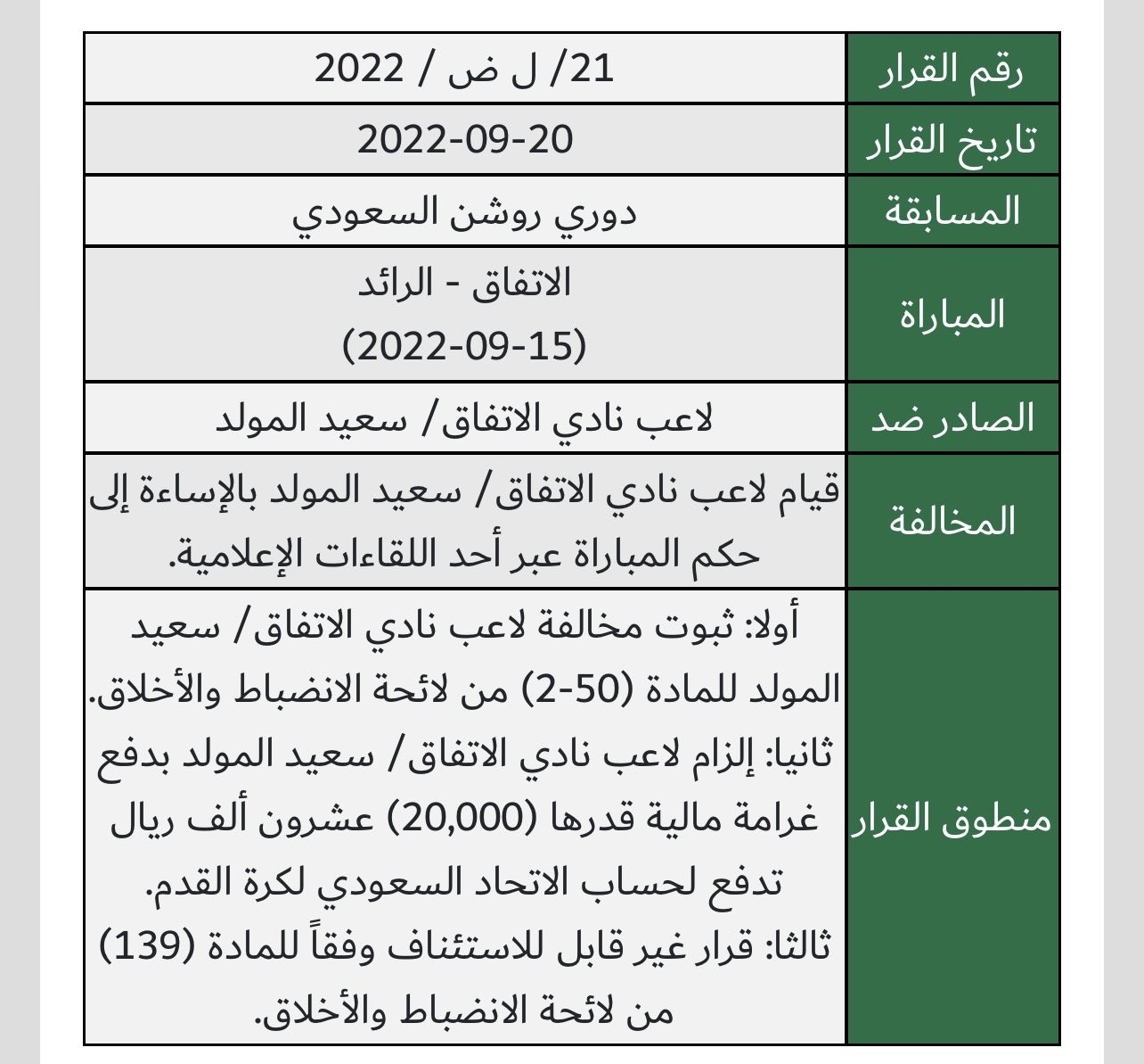 أعلنت لجنة الانضباط بالاتحاد السعودي لكرة القدم، اليوم الثلاثاء، عن فرض غرامة مالية على لاعب الاتفاق سعيد المولد قدرها 20 ألف ريال لقيامه بالإساءة إلى حكم المباراة أمام الرائد عبر أحد اللقاءات الإعلامية.