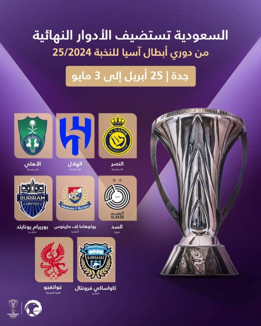 وكان الاتحاد الآسيوي لكرة القدم قرر في وقت سابق أن تستضيف المملكة الأدوار النهائية من دوري أبطال آسيا للنخبة بنظامها الجديد لكل من نسختي 2025 و 2026، وستستضيف جدة الأدوار النهائية من البطولة انطلاقًا من الدور ربع النهائي وحتى المباراة النهائية، خلال الفترة من 25 أبريل وحتى 3 مايو المقبلين، على ملعبي مدينة الملك عبدالله الرياضية وملعب مدينة الأمير عبدالله الفيصل الرياضية.