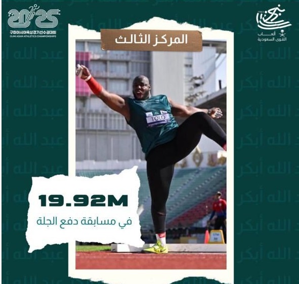 الرامي السعودي محمد تولو يحقق المركز الثالث والميدالية البرونزية في مسابقة دفع الجلة، بعد أن سجّل رمية بلغت 19.92 متر في منافسة قوية ومثيرة، وذلك في بطولة آسيا الـ26 في جومي بكوريا الجنوبية، ويعد تولو صاحب الرقم الآسيوي والسعودي في هذه المسابقة بمسافة قدرها 20,80 م ، وقد شارك تولو يوم أمس مع 15 لاعبًا يمثلون دول قارة آسيا.