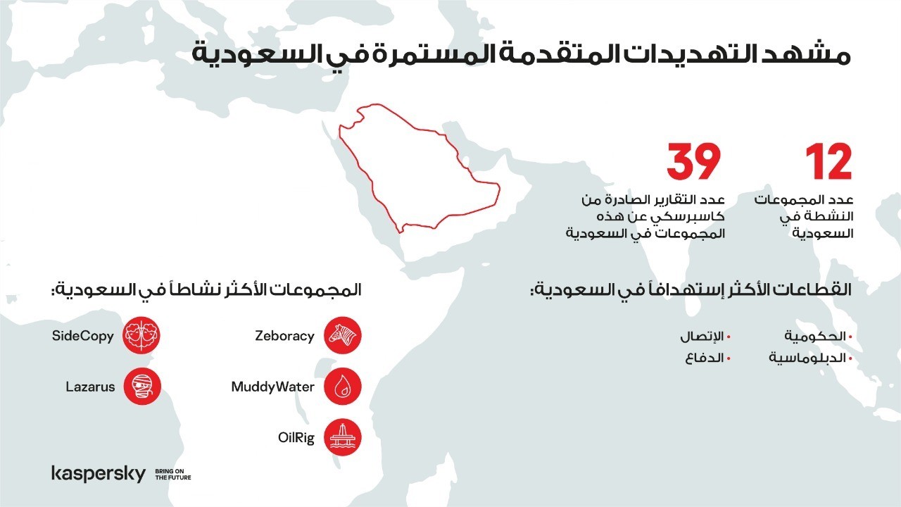 واشتملت التقارير على معلومات عن التهديدات والتحقيقات المرتبطة بالعصابات الرقمية التي تستهدف المملكة، التي تُعدّ صاحبة ثاني أكبر عدد من التقارير الصادرة من جميع دول الشرق الأوسط، ما يجعلها واحدة من أكثر البلدان المستهدفة في المنطقة. ووجدت كاسبرسكي أن هذه العصابات تستهدف في الأساس المؤسسات الحكومية والهيئات الدبلوماسية فضلًا عن المؤسسات التعليمية وشركات الاتصالات في المملكة. وتشمل الجهات المستهدفة الأخرى المؤسسات المالية وشركات تقنية المعلومات ومرافق الرعاية الصحية وشركات المحاماة ومؤسسات الجيش والدفاع. وشملت بعض العصابات الرقمية سيئة السمعة التي تقف وراء التهديدات المتقدمة المستمرة والتي جرى التحقيق فيها في المملكة، Lazarus وMuddyWater وOilRig وSideCopy.