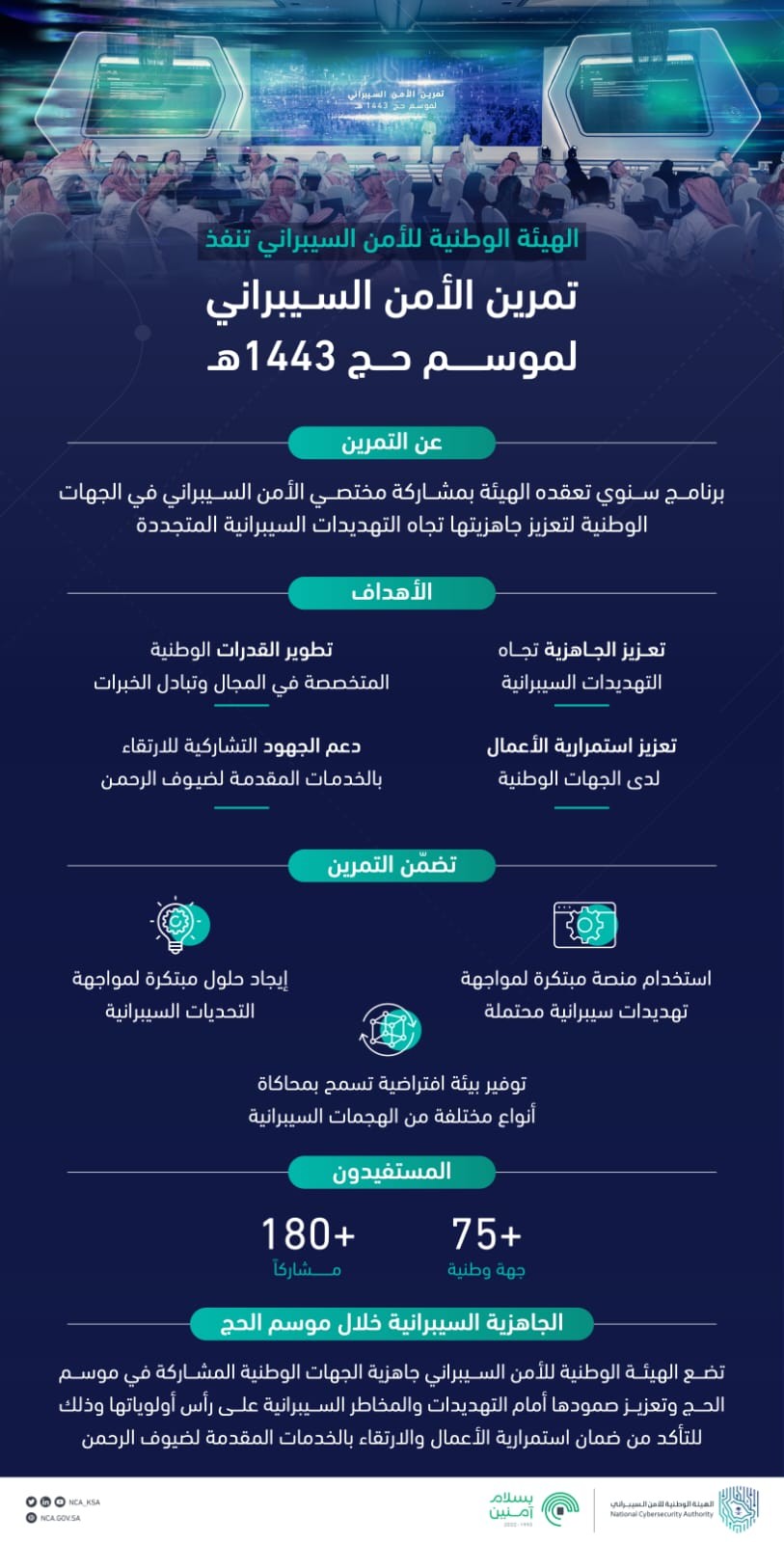 نفذت الهيئة الوطنية للأمن السيبراني اليوم «تمرين الأمن السيبراني لموسم حج 1443هـ» بهدف تعزيز الجاهزية السيبرانية لدى الجهات الوطنية المشاركة في موسم حج 1443هـ، وتطوير القدرات الوطنية المتخصصة في مجال الأمن السيبراني، وتعزيز استمرارية الأعمال خلال الموسم، وذلك بمشاركة أكثر من 75 جهة وطنية مثلها أكثر من 180 مختصاً بالأمن السيبراني.