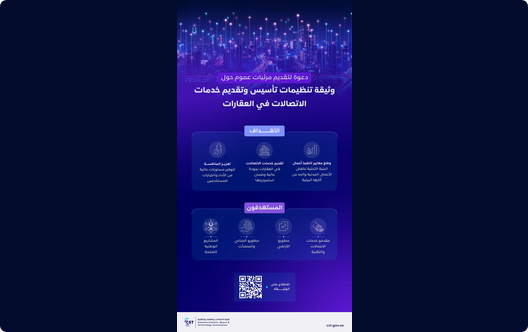 وتهدف الوثيقة إلى تقديم خدمات الاتصالات في العقارات بجودة عالية وضمان استمراريتها، وتعزيز المنافسة لتوفير مستويات عالية من الأداء والخيارات للمستخدمين، ووضع معايير لتنفيذ أعمال البنية التحتية لخفض الأعمال المدنية والحد من آثارها البيئية وفقًا لأفضل الممارسات العالمية.
