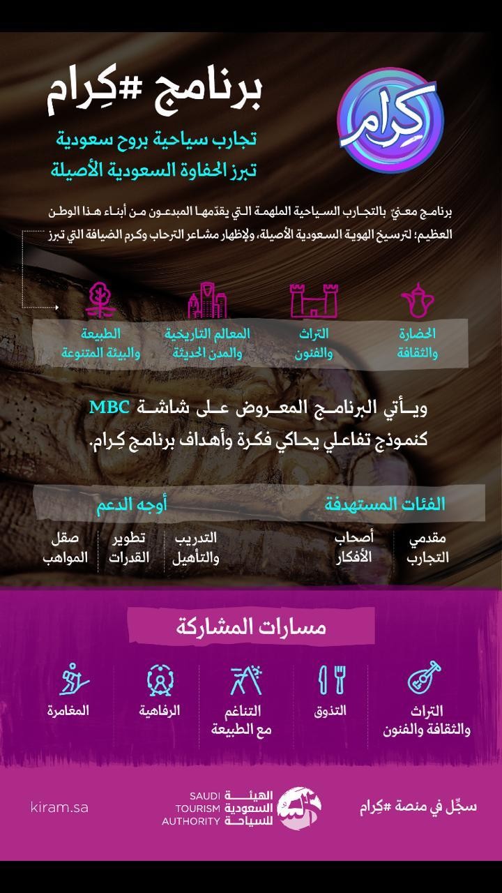 أطلقت الهيئة السعودية للسياحة، برنامج "كِرام"، لتعزيز التجارب السياحية الملهمة التي يقدّمها المبدعون والمبدعات؛ لترسيخ الهوية الوطنية الأصيلة، ولإظهار مشاعر الترحاب وكرم الضيافة، وإبراز ما تملكه المملكة العربية السعودية من حضارة وثقافة وتراث وفنون، ومعالم تاريخية ومدن حديثة، وبيئة متنوعة وطبيعة خلابة وأجواء ساحرة للسياحة، ليلتحق به أصحاب التجارب السياحية.