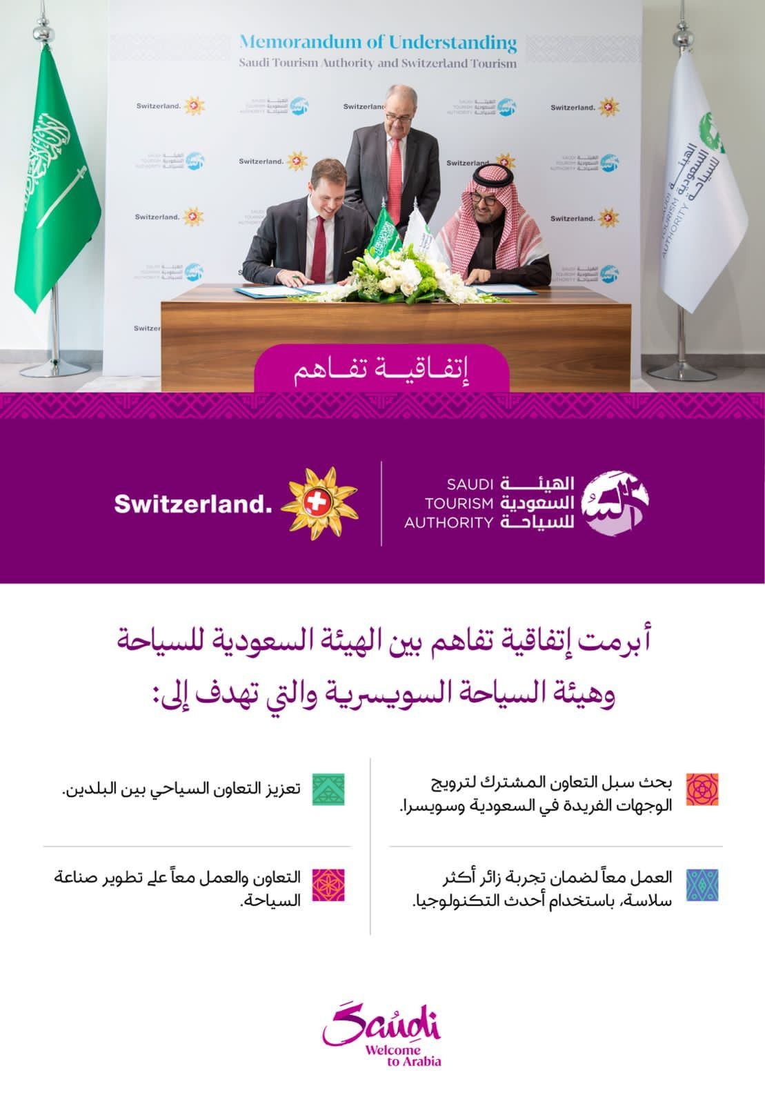 أعلنت الهيئة السعودية للسياحة عن توقيع مذكرة تفاهم مع هيئة السياحة السويسرية، تهدف إلى تعزيز التعاون المشترك، وتمت مراسم التوقيع في مقر الهيئة السعودية للسياحة. وحضر مراسم التوقيع معالي السيد غي بارميلان عضو المجلس الفيدرالي ووزير الاقتصاد والتعليم والبحث السويسري، وسعادة السفيرة ياسمين شاتيلاو سفيرة جمهورية سويسرا الاتحادية لدى المملكة السيدة، ووقّع الاتفاقية، الرئيس التنفيذي للهيئة السعودية للسياحة، الأستاذ فهد حميد الدين، ومدير منطقة دول مجلس التعاون الخليجي في هيئة السياحة السويسرية، السيد إيفيو غوتز. وتُعتبر هذه الاتفاقية الأولى من نوعها بين الهيئتين، من أجل تبادل الخبرات والرؤى والمعلومات، وإطلاق المبادرات والمشاريع والبرامج المشتركة.