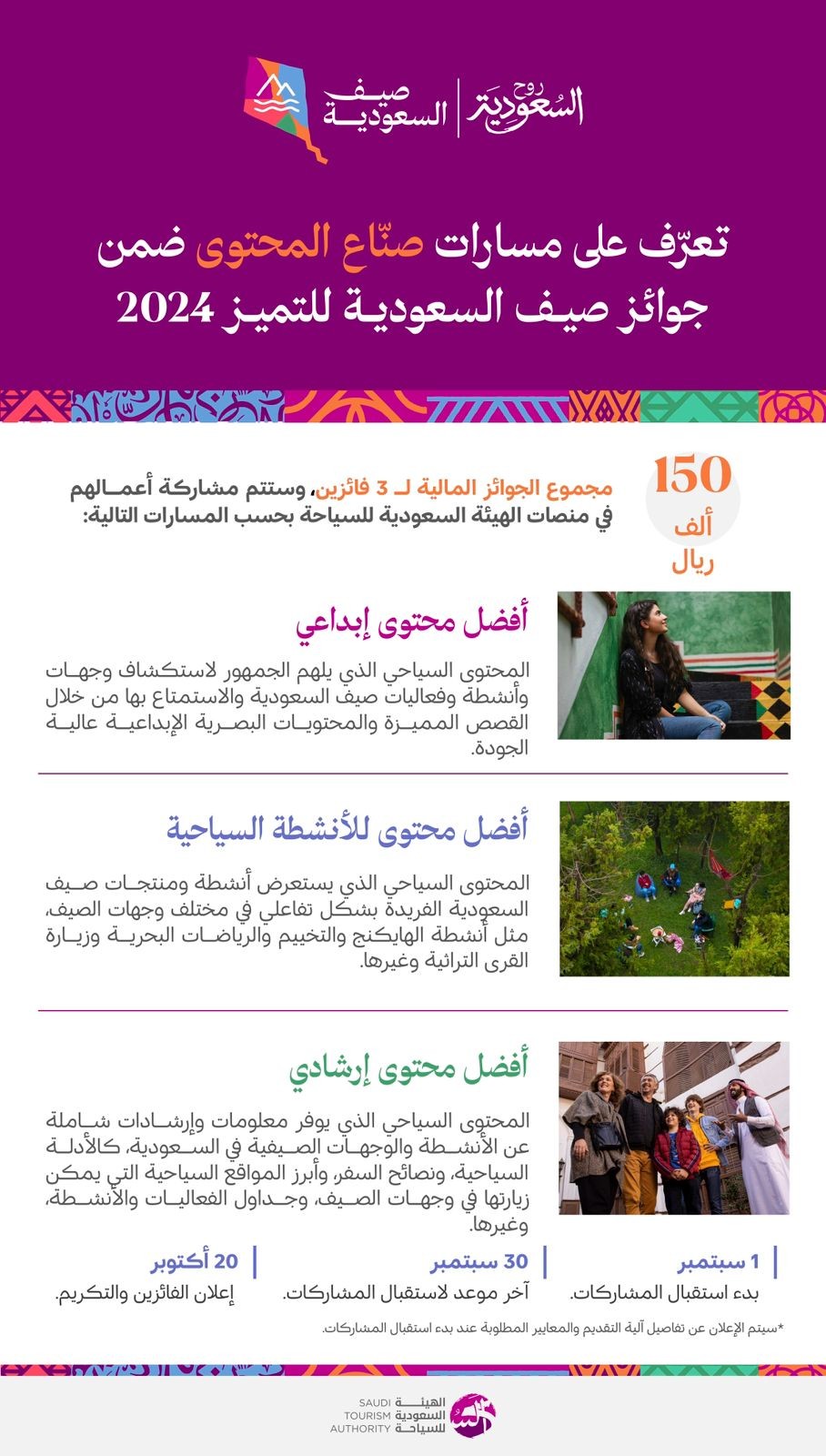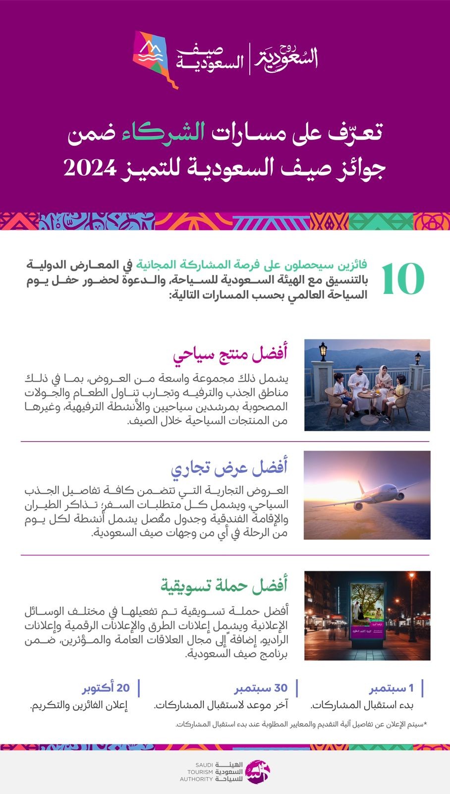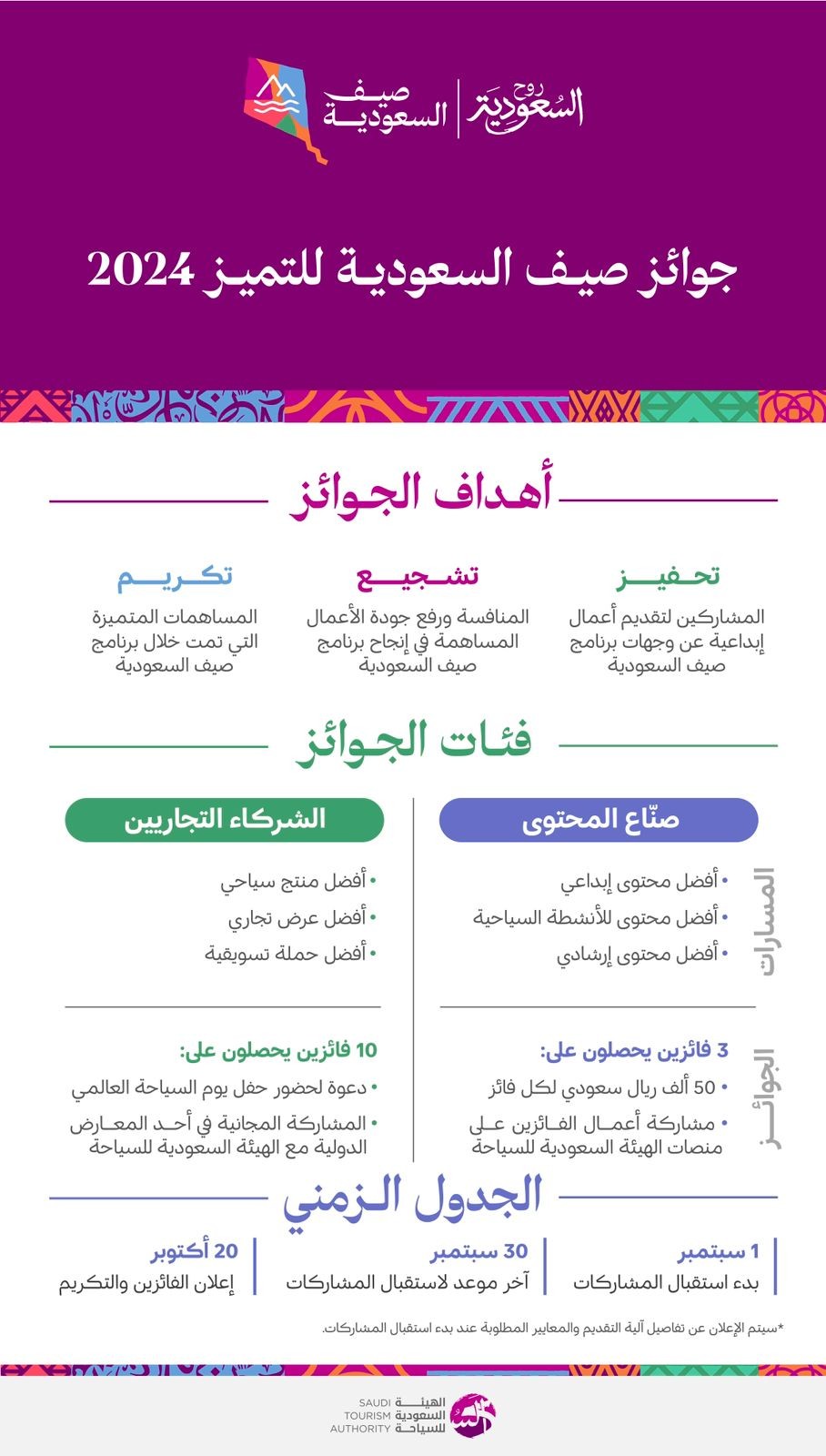 كما أعلنت الهيئة عن الإطار الزمني لهذه الجوائز القيمة، والتي سيتم فتح باب استقبال المشاركات المتميزة فيها بداية 1 سبتمبر 2024، وآخر فرصة لاستلام المشاركات بنهاية يوم 30 سبتمبر 2024، كما سيتم إعلان النتائج في 20 أكتوبر 2024، والإعلان عن آلية التقديم واستقبال المشاركات في وقت لاحق.
