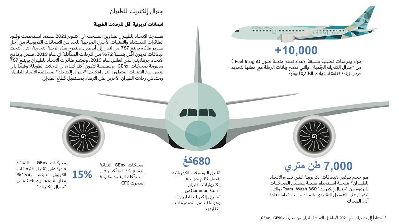 وقعت الاتحاد للطيران مذكرة تفاهم مع "جنرال إلكتريك" تمهد طريق الجانبين لاغتنام الفرص المستقبلية والتعاون ضمن مبادرات مبتكرة للحد من الانبعاثات الكربونية الصادرة عن أسطول طائرات الاتحاد للطيران من طراز بوينغ 787 في إطار برنامج الناقلة الشامل لتعزيز الاستدامة. ووقع الاتفاقية كل من توني دوغلاس، الرئيس التنفيذي لمجموعة الاتحاد للطيران، وجون سلاتري، الرئيس والمدير التنفيذي لشركة "جنرال إلكتريك للطيران" خلال حفل خاص أقيم على هامش "معرض دبي للطيران 2021".