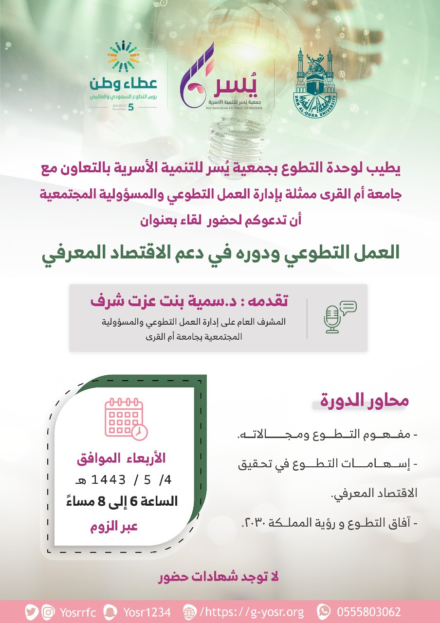 وحدة التطوع بجمعية يسر للتنمية الأسرية بمكة تقيم لقاء بعنوان :(العمل التطوعي ودوره في دعم الاقتصاد المعرفي)