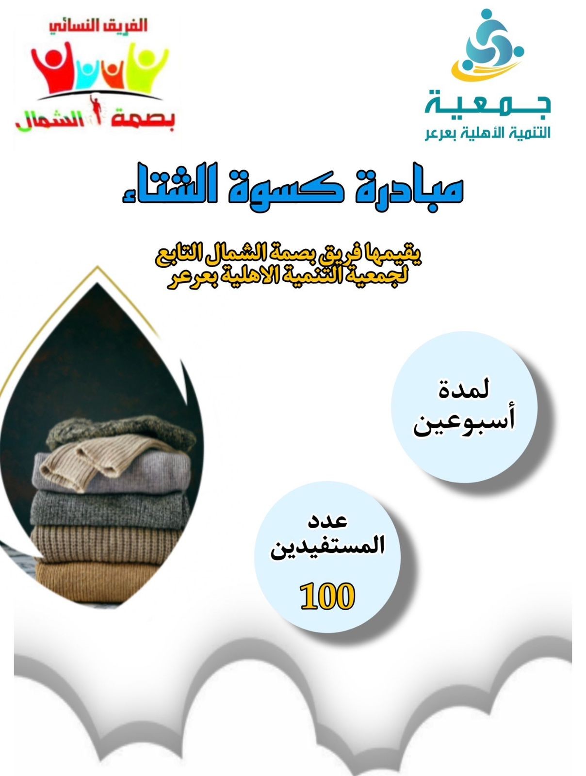 نفًذ فريق بصمة الشمال التطوعي التابع لجمعية التنمية الاجتماعية الأهلية بمدينة عرعر، حملة دفء الشتاء لتوزيع كسوة الشتاء في عامها الرابع على الفقراء والمحتاجين من العمالة والرعاة الوافدة الساكنة والعاملة في أطراف المنطقة، وتضمنت الحملة توزيع أكثر من 100 حقيبة اشتملت على بيجامات شتوية، وقبعة، وقفازات صوفية وشال وجاكيت.