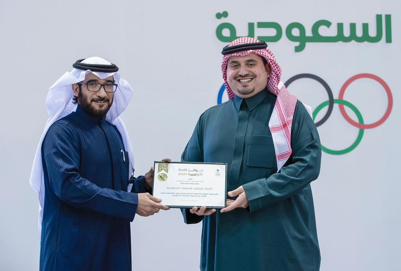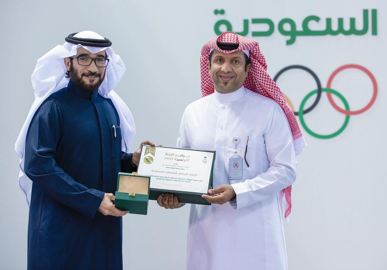 حيث كرم صاحب السمو الأمير فهد بن جلوي نائب رئيس اللجنة الأولمبية والباروالمبية العربية السعودية سعادة رئيس الاتحاد الدكتور خالد بن صالح المزيني وذلك خلال انعقاد الجمعية العمومية الخامس والعشرين للجنة الأولمبية  مساء أمس بجائزة اللجنة الأولمبية لرياضة المرأة 2021 نظير جهود الاتحاد في تفعيل البطولات الجامعية النسائية بشكل مميز ساهم في تمكين اللاعبات من منسوبات الجامعات السعودية الحكومية والأهلية.
