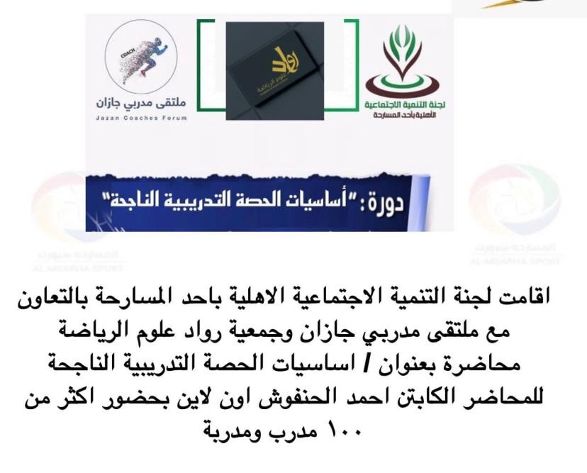 أقامت لجنة التنمية الاجتماعية الأهلية بمحافظة أحد المسارحة جنوب منطقة جازان بالتعاون مع ملتقى مدربي جازان وجمعية رواد علوم الرياضة محاضرة تدريبة بعنوان"أساسيات الحصة التدريبية الناجحة" للمحاضر الكابتن أحمد الحنفوش أحد الكوادر التدريبية الوطنية بنادي الإتفاق السعودي.
