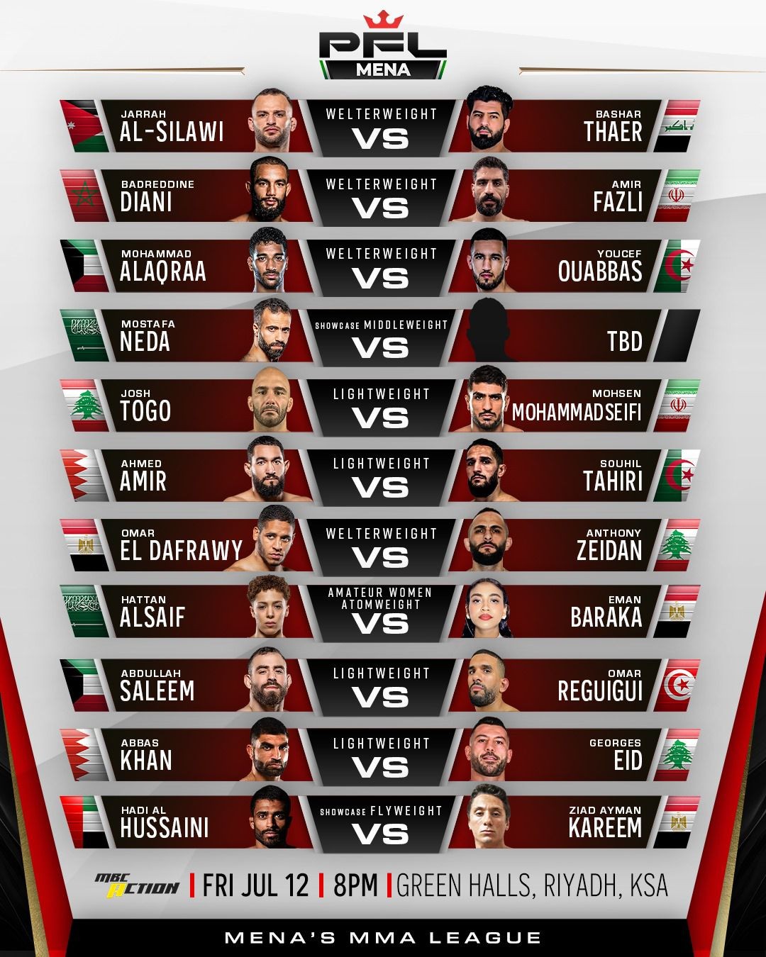 يشار بأن سيتم بث نزالات الليلة الثانية لدول مينا في رابطة المقاتلين المحترفين (PFL)، مباشرة على قناة إم بي سي أكشن.