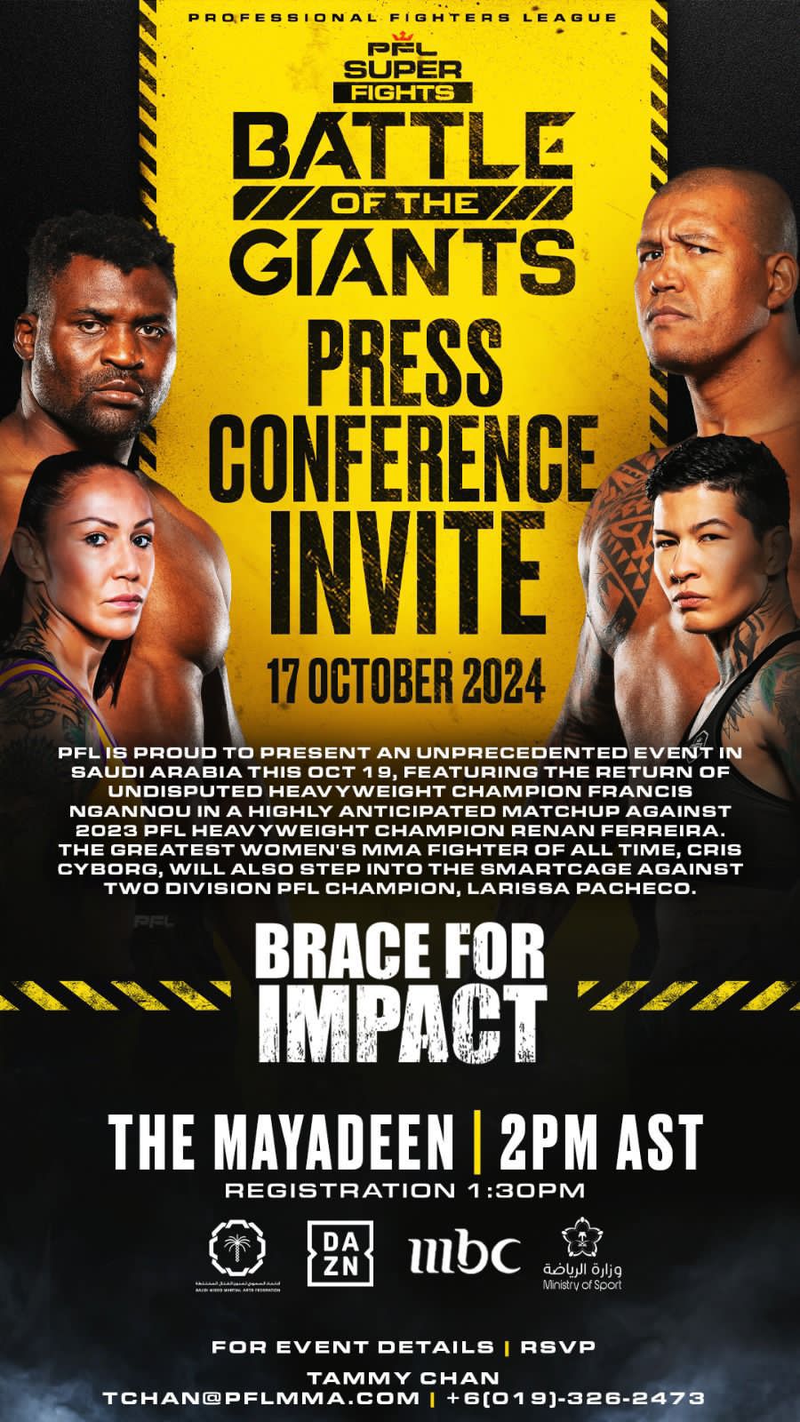 تعقد رابطة المقاتلين المحترفين (PFL) لمنطقة الشرق الأوسط وشمال إفريقيا, مؤتمراً صحفياً عند الساعة الثانية من ظهر يوم الخميس القادم17 أكتوبر في "ميادين - البوليفارد" بالرياض, للكشف عن "معركة العمالقة" التي ستقام يوم 19 الجاري.