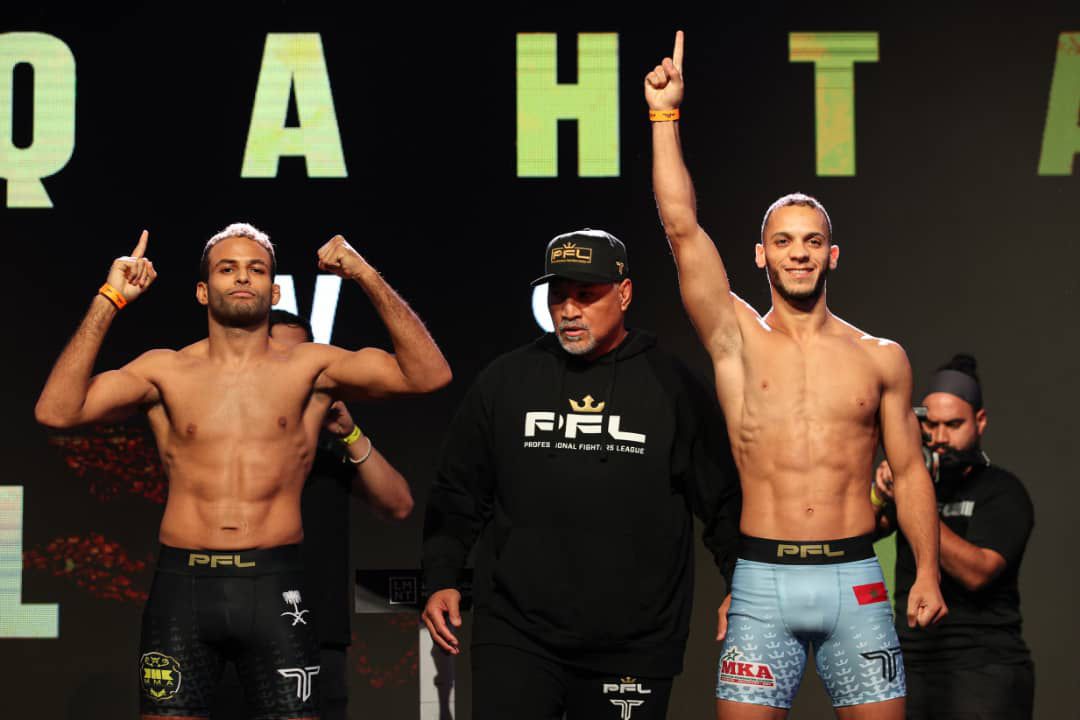 وأقامت رابطة المقاتلين المحترفين (PFL)،مساء أمس فعالية الوزن الرسمية , حيث نجح جميع المقاتلين المشاركين في البطولة في اجتياز الوزن المطلوب، باستثناء عدد من التغييرات الطارئة, ففي نهائي (PFL)، تمّ استبدال المقاتل الأردني عبد الرحمن الحياصات بالمغربي مروان بلغويت الذي سيواجه السعودي عبد الله القحطاني, أما في المواجهات الاستعراضية، فقد استُبدل جيسوس بينيدو بغابرييل براغا لمواجهة جيريمي كينيدي, وفي النزال النسائي لوزن الذرة، ستقام مواجهة هتان السيف أمام ليليا عثماني على وزن اتفاقي 109 أرطال.