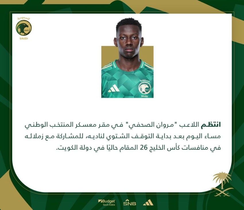 وأوضح الحساب الرسمي للمنتخب السعودي، بأن مروان الصحفي انضم لصفوف الأخضر، بعد فترة التوقف الشتوي لناديه، للمشاركة مع زملائه في بطولة كأس الخليج.وتأهل الأخضر إلى نصف نهائي كأس الخليج، بعد الفوز على العراق بثلاث أهداف مقابل هدف، في المباراة التي أقيمت أمس السبت، بالجولة الثالثة من البطولة.
