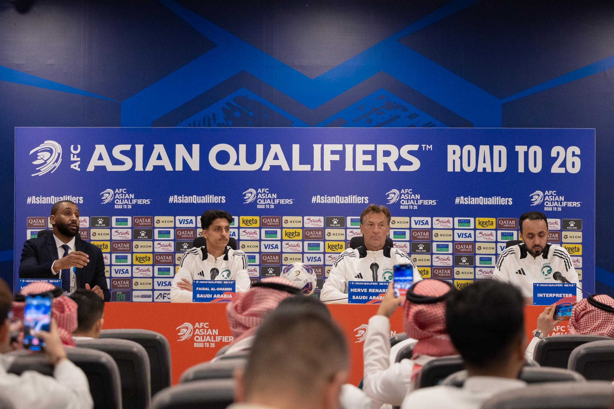 عقد المدير الفني للمنتخب السعودي الفرنسي إيرفي رينارد، مساء اليوم الأربعاء، مؤتمراً صحفياً تحث فيها عن إستعدادات المنتخب لملاقاة نظيرة الصيني، مساء غداً الخميس، وذلك ضمن الجولة السابعة من التصفيات الإسيوية المؤهلة لكأس العالم 2026، على ملعب الأول بارگ بالعاصمة الرياض.