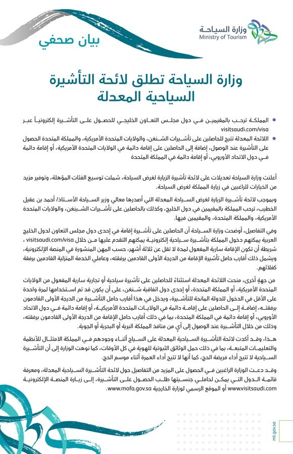 اعلنت وزارة السياحة عن إتاحة التأشيرة السياحية للمقيمين في دول الخليج وأيضا الحاصلين على تأشيرة من الولايات المتحدة الأمريكية أو المملكة المتحدة أو إحدى دول اتفاقية شنغن كما يشمل السماح المقيمين بشكل دائم في دول الاتحاد الأوربي والولايات المتحدة الأمريكية والمملكة المتحدة.